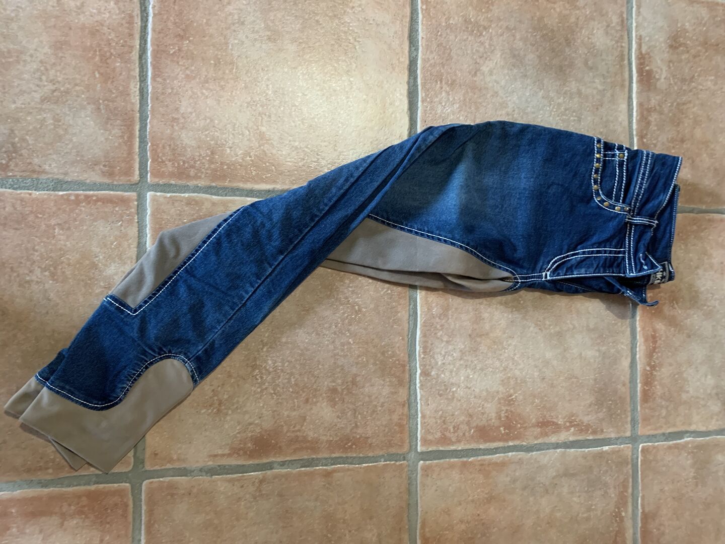 Ridbyxor av denimtyg och läderimitation. - Jag säljer mina knappt slitna knäbyxor av denimtyg och läderimitation. Lite skrynklig på grund av liggande men ingen skada. Paypal är tillgängligt