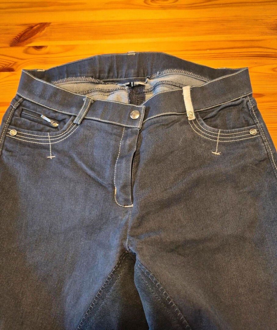 Mycket snygg med de vita dekorativa sömmarna och den mörkblåa fulla sitsen. Tätt åtsittande på benet , vid ankeln med stretchinsats i sidan . Lite sliten, därför ingen pilling, inga hål u även dragkedjan är topp . Vänligen kontakta mig om du har några frågor :)