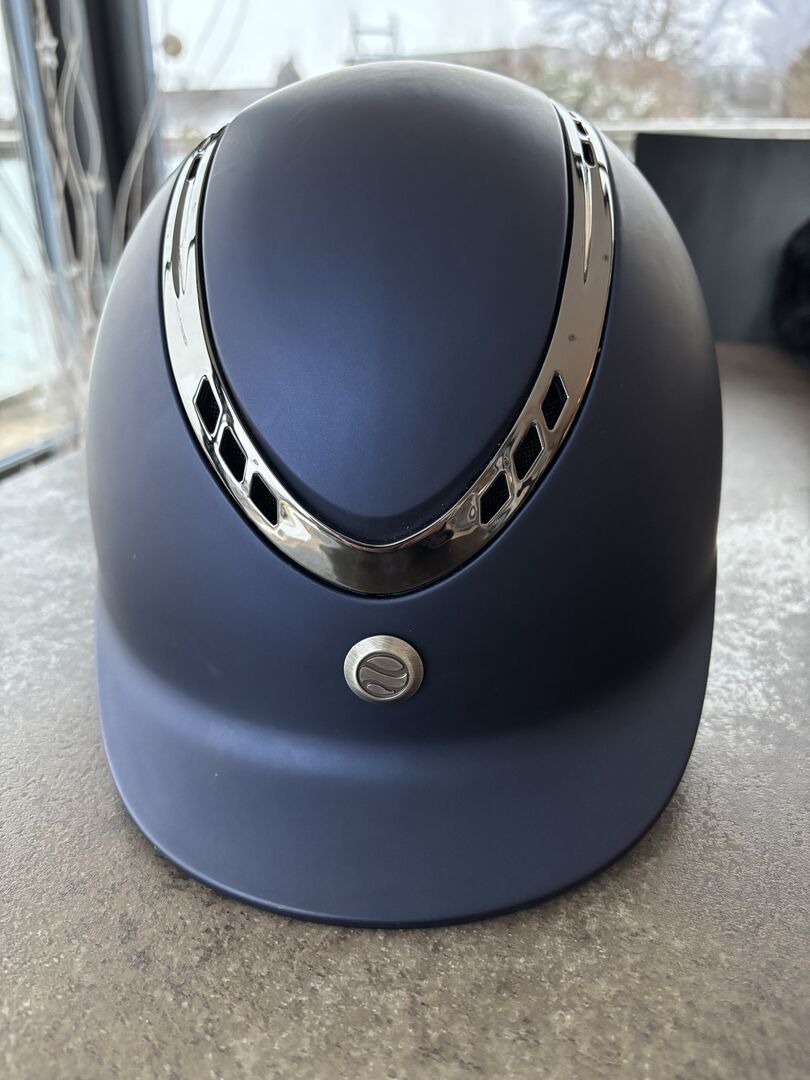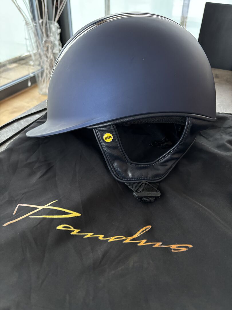 Ridhjälm med MIPS - Vacker !NY! Ridhjälm från Back on track, smoothtop, blå. Storlek M för huvudomfång 56-58 cm. Med MIPS-system för mycket hög säkerhet vid en eventuell kollision. 3-punktsfäste och hjul för storleksjustering. Med original hjälmväska.