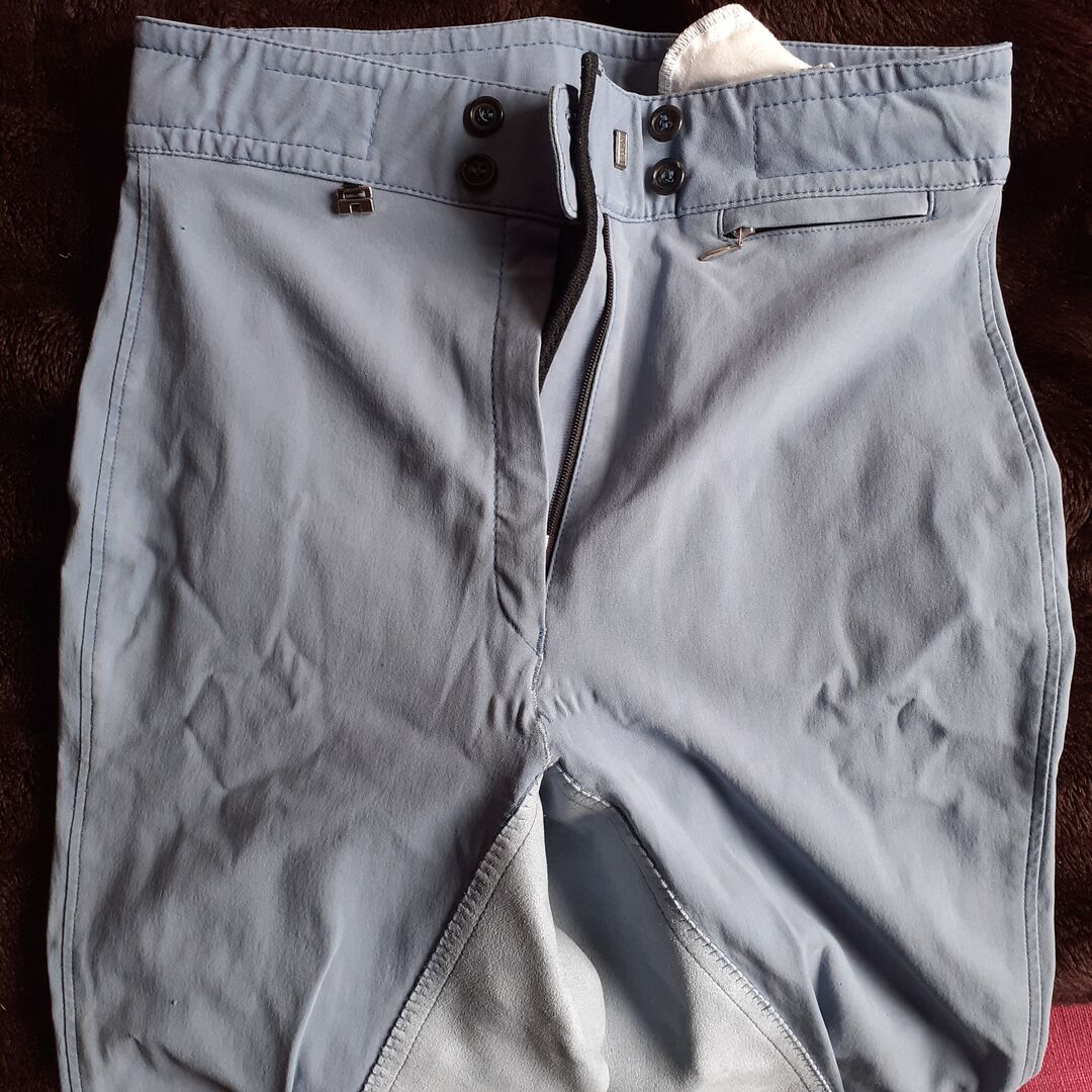 Ridkläder - Ljusblå elastanbyxor, full läder sits, storlek 84