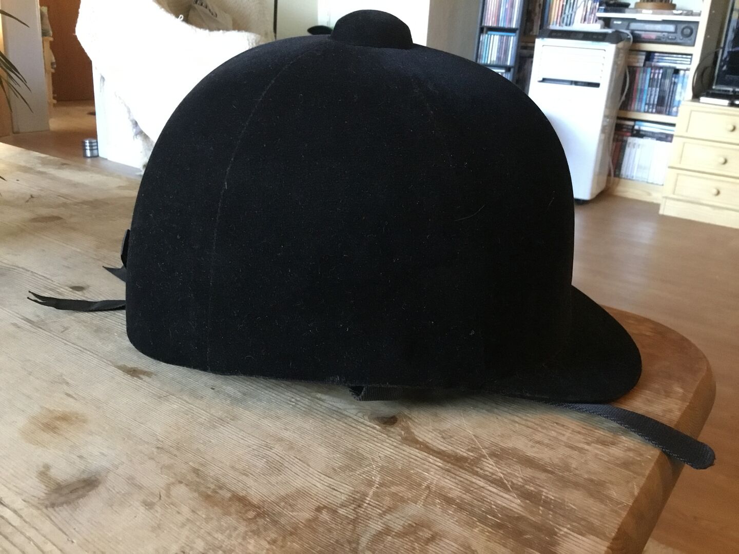 Ridmössa storlek 54 är mindre - Jag ger bort en välskött ridmössa med svart sammetsöverdrag i storlek 54, som definitivt är mindre på grund av vadderingen. Den kan också skickas till dig om du betalar fraktkostnaderna.