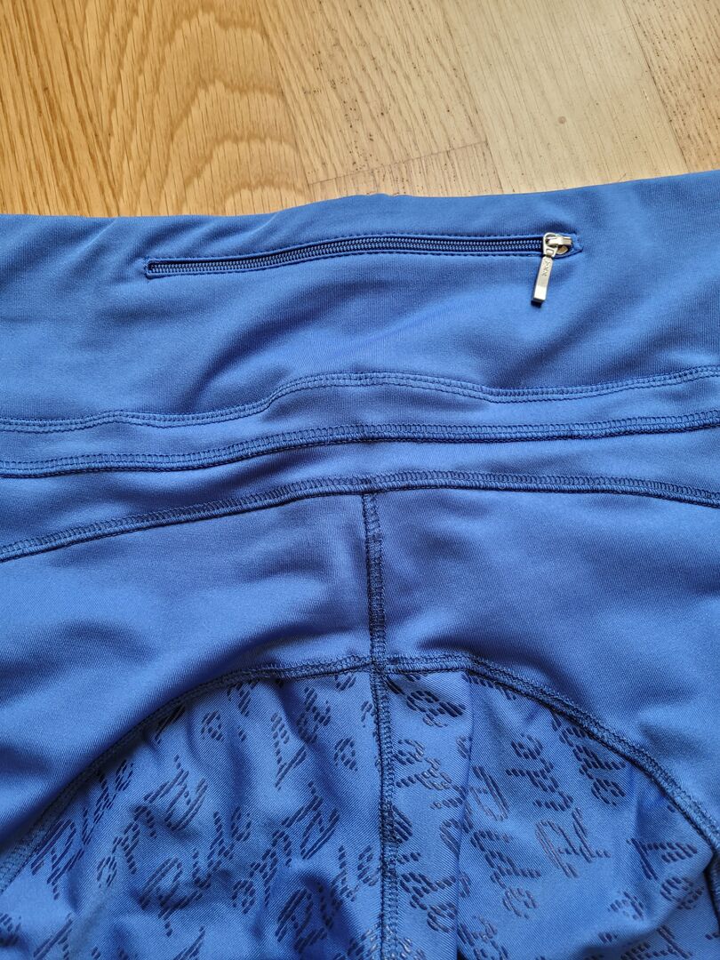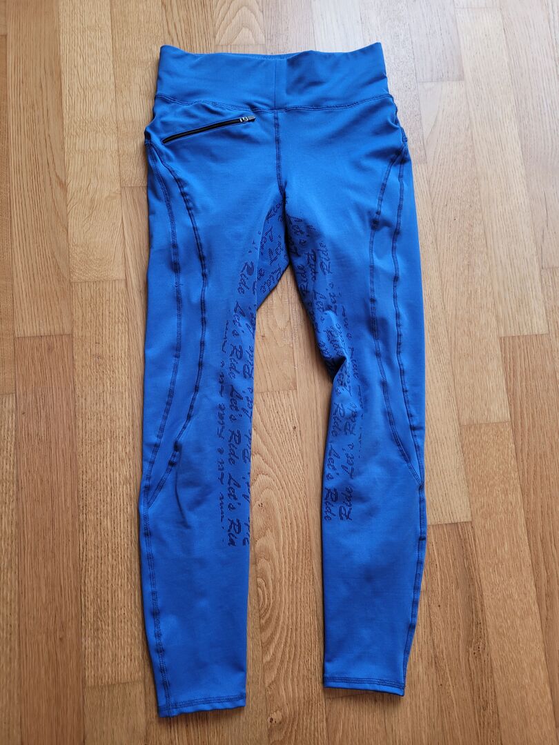 Ridning legging - Blå ridleggings från Euro-Star med fullt grepp. Stretchigt material och mycket bekväm. Hög skärning med resår i midjan. Framficka med dragkedja, bakre linning har även en stor ficka med dragkedja. Storlek: 170 Material: 83% polyester, 17% elastan