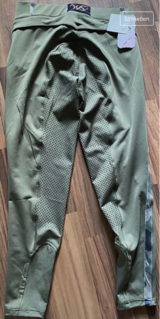 Fin olivgrön färg med mönsterränder i kamouflage, sidofickorna är tillräckligt stora för att rymma en mobiltelefon. Byxorna är helt nya och oanvända med etikett, eftersom de köptes under graviditeten och nu tyvärr är för stora.