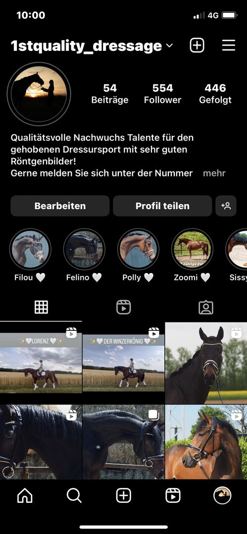 Jag har varit utbildad hästtränare i klassisk ridutbildning sedan 2018 med placeringar från ridhästtester till klass "S" och erbjuder dig mitt stöd i Rhein Kreis Neuss och särskilt på Hilgershof ridstall, från ridlektioner till fullständiga rapporter. Särskilda önskemål om utfodringskoncentrat, hö och turnout samordnas i detalj och implementeras noggrant med uppmärksamhet på detaljer.