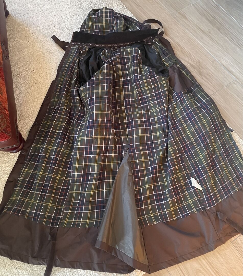 Ridning mackintosh Felix Bühler storlek L - Begagnad ridmackintosh i brunt från Kraemer. Inga revor eller andra skador. Kappan har en praktisk ridslits och remmar för att fästa kappan på benen när man rider så att de inte blir blöta.