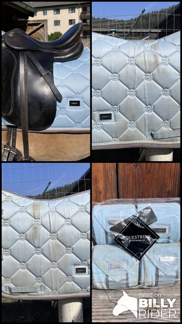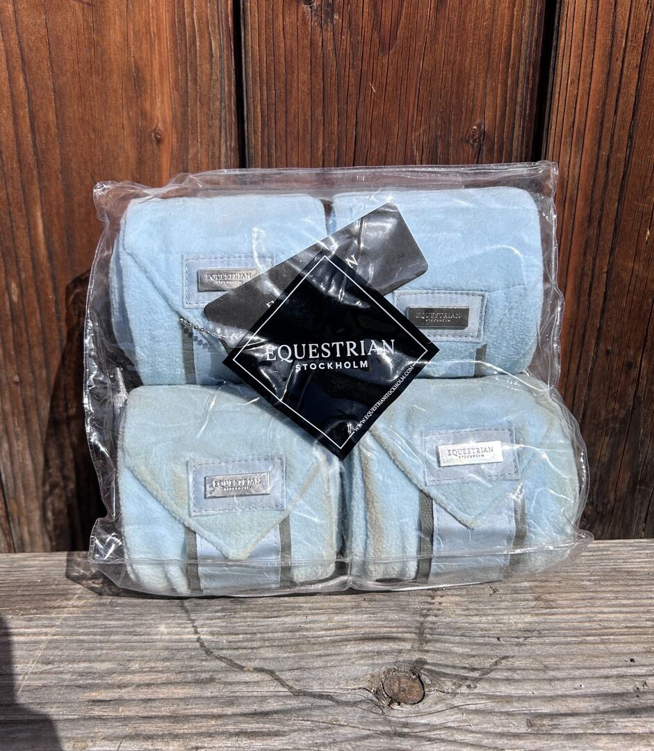 Ridsport Stockholm Set IceBlue - Säljer mitt set från Equestrian Stockholm i färgen Iceblue, bestående av schabrak DL & bandage WB. Schabraket har sällan använts & har inga tecken på slitage (kan fortfarande tvättas om så önskas). Två bandage har använts en gång, de andra två är nya.