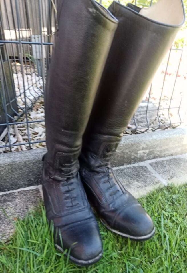 Ridstövlar "Felix Bühler - Dressyrridstövlar "Felix Bühler", storlek 41, korta/breda. Vänligen se bilder för exakta mått. Dragkedja och tryckknappar fullt funktionella Som privat försäljning ingen garanti - ingen retur