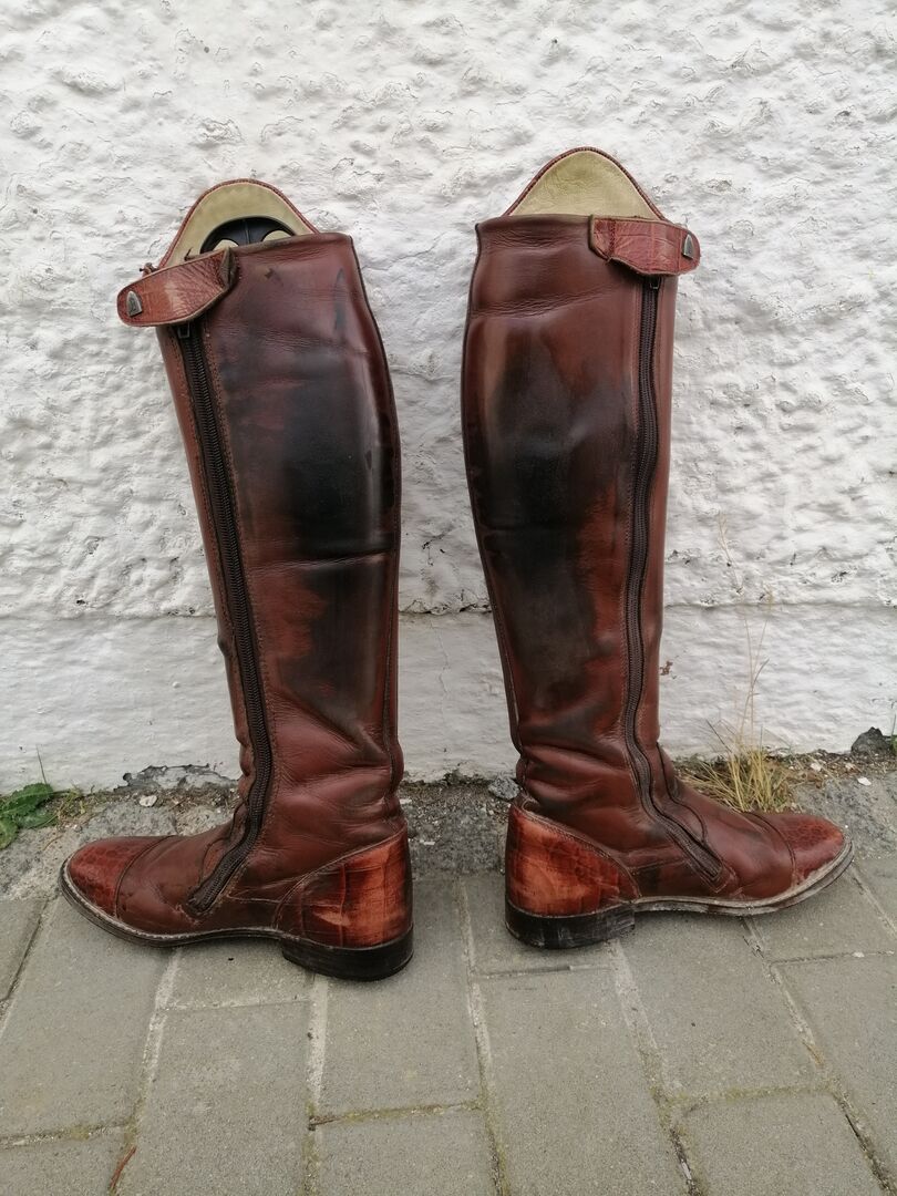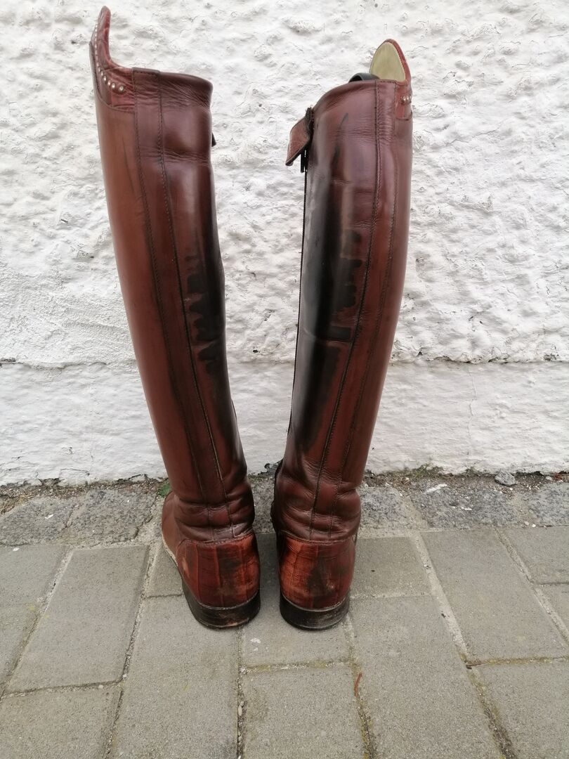 Ridstövlar i läder, dressyrstövlar, storlek 38 - Sälj Stora bruna läderstövlar med glitterstenar Skostorlek 38 (37,5cm) Skafthöjd med klack: 48 cm (mätt på baksidan) Kalv (ytterst vid den bredaste punkten): 38 cm - jag har själv kalvbredd 36 (med Cavallo-stövlar) och stöveln passar utmärkt. Vristbredd: 30cm Toppskick, stövlarna har bara burits lite. Frakt: 4 EUR
