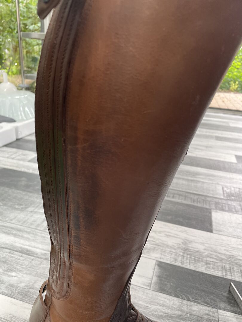 Ridstövlar nästan som nya - Från Loesdau, köpte som B-varor för 149,-, har bara burits två gånger, är för trånga för mig. För "defekter" se bilderna. Genomgående dragkedja med elastisk resår.
