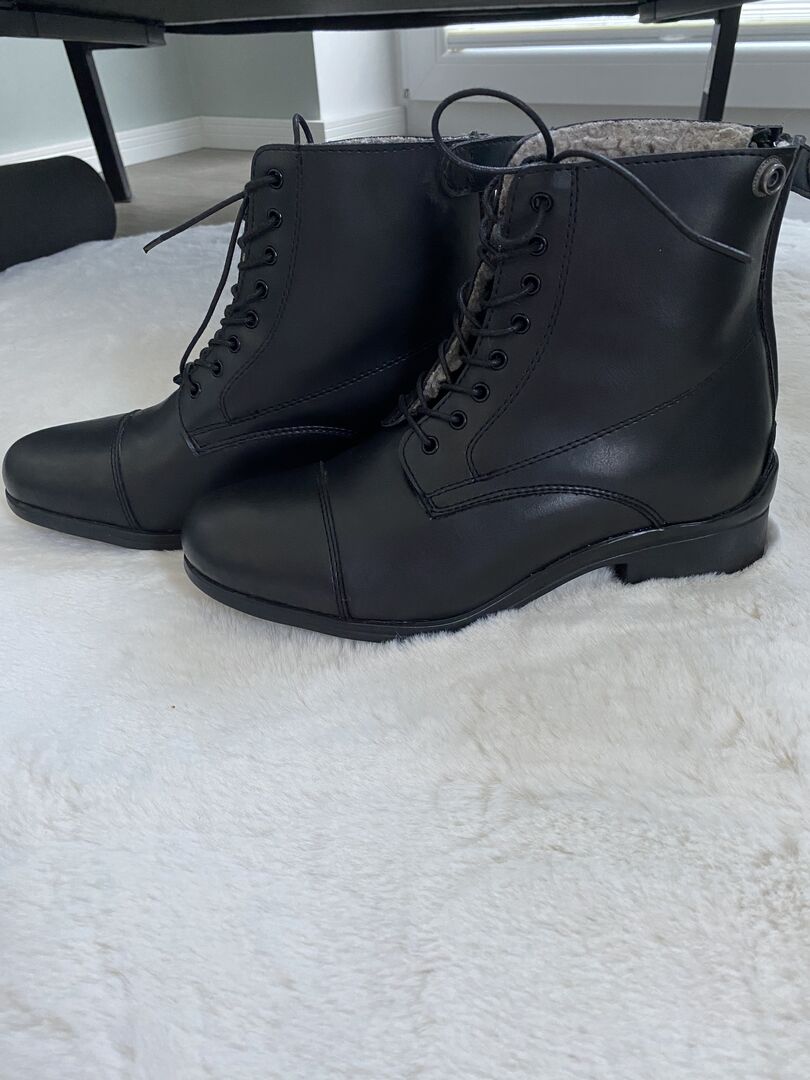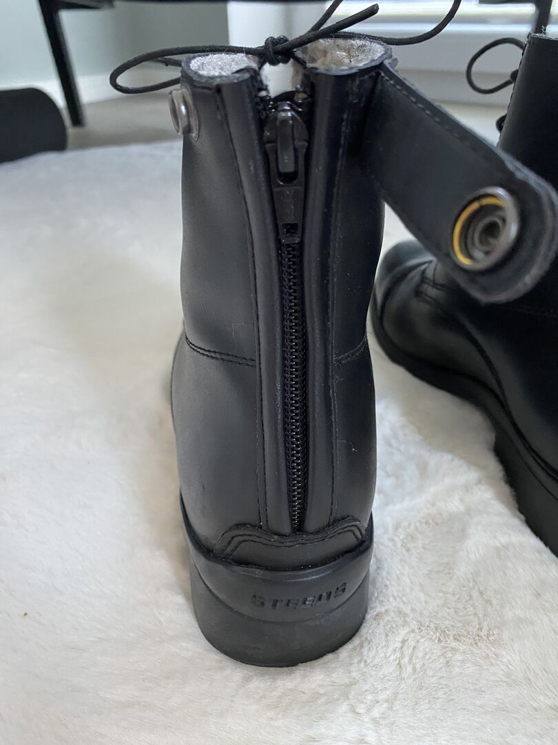 Ridstövlar (Steeds) - Jag har bara använt dessa ridstövlar från Steeds några gånger eftersom jag slutade rida kort efter att jag köpte dem. Stövlarna är fodrade på insidan så att de håller dig varm och skön. De är gjorda av konstläder och har dragkedja baktill, med ett spänne ovanför dragkedjan för extra stöd. Storleken är 38 och de passar så här. Skorna har inga defekter. Kontakta mig gärna om du är intresserad! :)