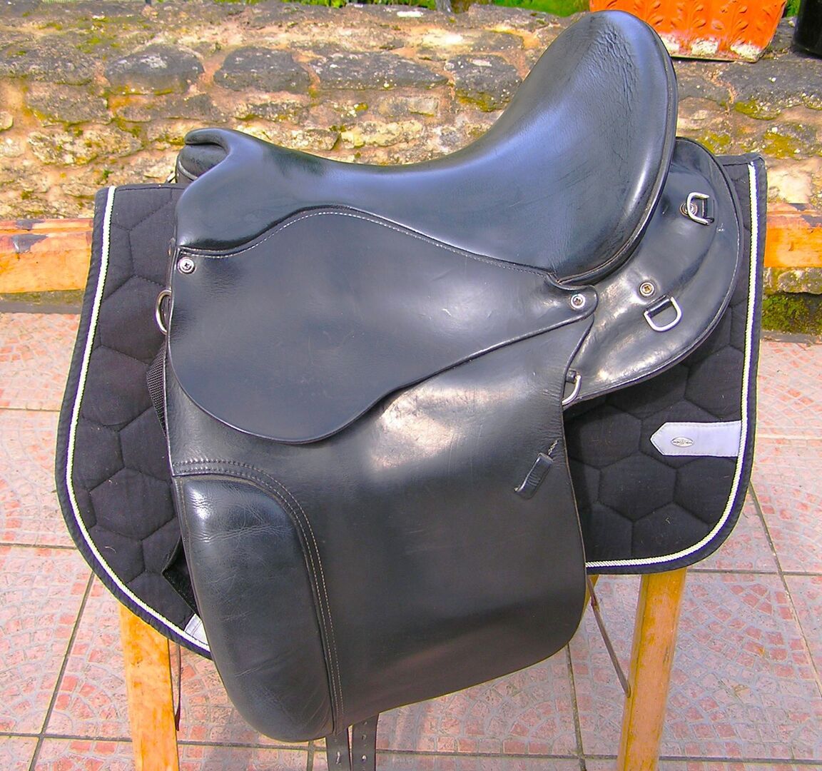 Rieser sadel dressyr och terräng, 16 tum, kort bred, även för små hästar - Till salu en mycket bekväm Rieser-sadel för dressyr och terrängridning med 3 D träd. Passar hästar med breda axlar och breda ryggar med liten till medelstor svank. Jag hade den på en ung Isi. 3D-trädet är justerbart. Equiscandata av den unga Isi finns tillgängliga. Sadeln har små fasta knärullar och justerbara sadelgjordsband. Den djupa sitsen är superbekväm, även under längre ridturer. Sadeln är också lämplig för små hästar och med byxor i storlek 38 kan du fortfarande få plats i den 16 tum stora sitsen. Vikten är 8 kg. Sadeln har använts och visar små tecken på slitage, men är i mycket gott skick. Sadeln har just varit till Rieser och det fanns inget att klaga på. Frakt möjligt om kostnaderna täcks. Privat försäljning utan garanti, ingen retur, inget utbyte.