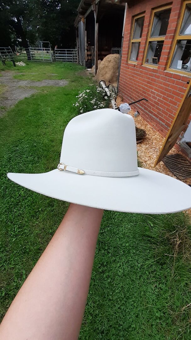 Rodeo King hatt 6 7/8 l oval cream 10xx till salu till ett förmånligt pris - En standard Rodeo King som ska ges billigt eftersom den har lätt missfärgning på undersidan och har varit i garderoben under lång tid. Jag gillar inte höga kronor, om du letar efter en showdekoration eller evenemangshatt i grädde med guld helt rätt. Fram något ur form god kvalitet men det har lätt missfärgning. .+7,50 Frakt (stort välpackat paket) ELLER med tillägg +25€ blå färgfodral. Hattfodral ... ( andra tillbehör se Resistol annons )