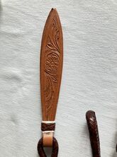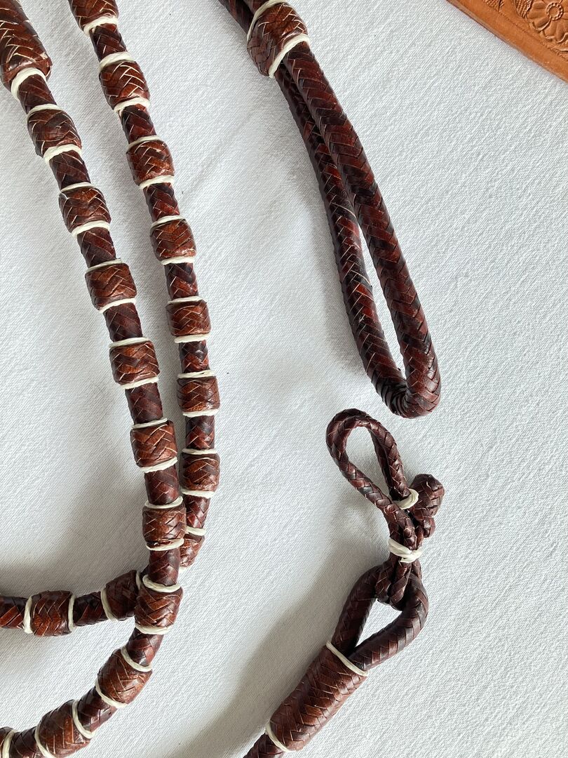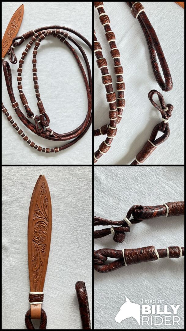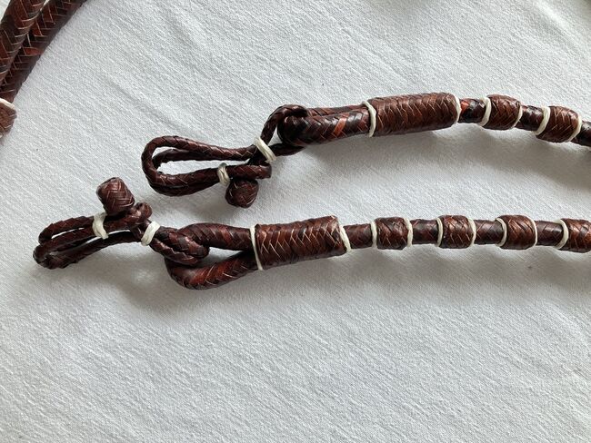 Jag säljer dessa nya rödbruna Romal Reins i råhud med läderflik. De har inte använts. På något sätt inte mina. Längd på tyglarna 1,40m. Flikens längd 27,5cm. Längd på bryggan inkl. flik 1,63m. Diameter 13 mm.
