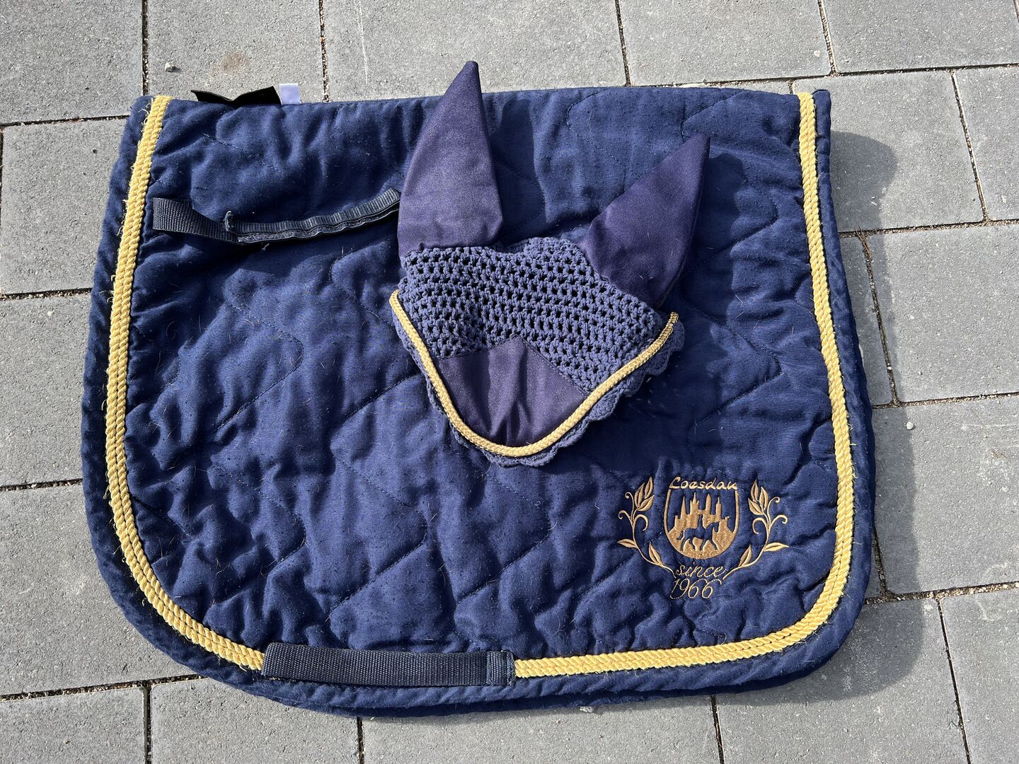 Royal Blue Saddle Pad med Fly Ears - 🤎SCHNAPPER!🤎 Jag ger bort hela uppsättningen för 15€. Den har använts lite och kommer naturligtvis att tvättas igen! Sadelunderlaget är tyvärr inte särskilt tjockt och du kan också se på bilderna att kvaliteten inte är den bästa. Därför säljer jag den för 15€, vilket inkluderar frakt♕.