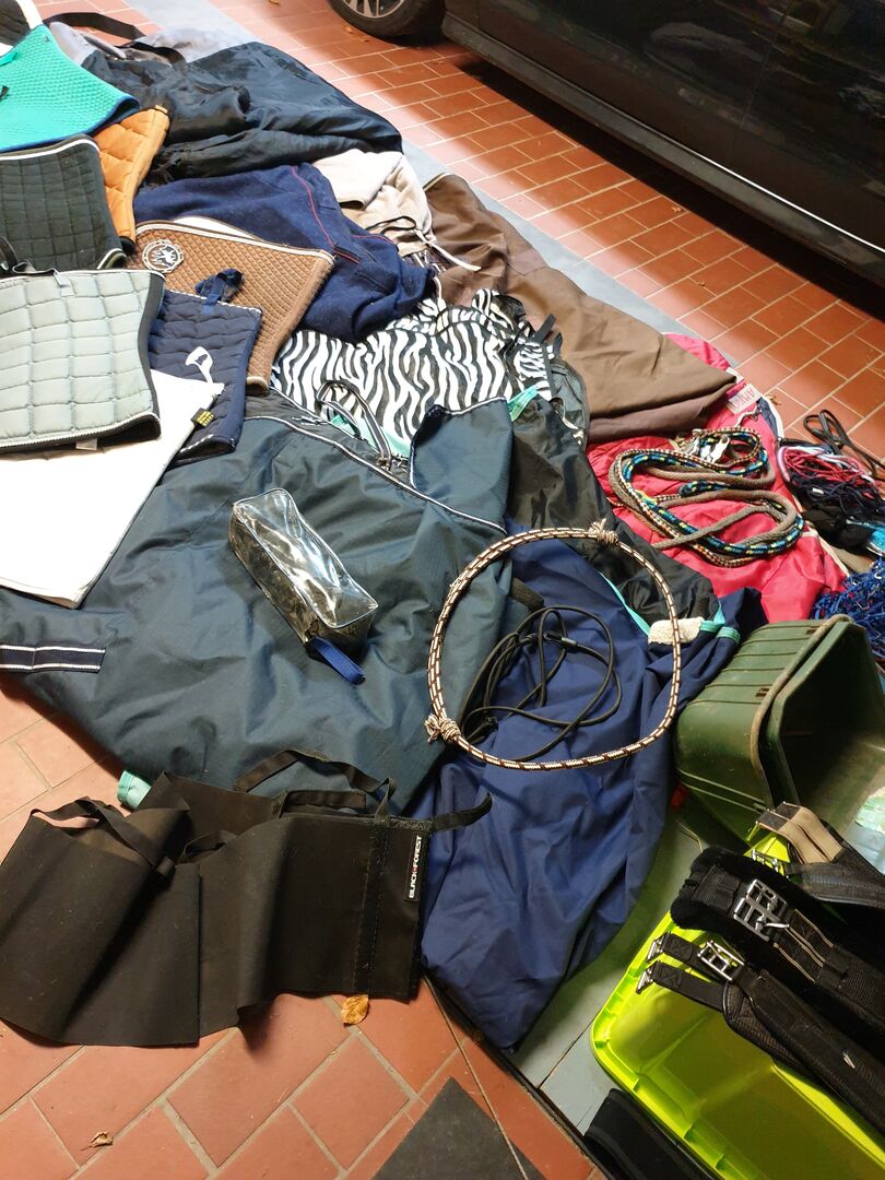Sommarmatta, vintermatta, regnmatta, stallmatta, svettmattor, Amigo Liner everything 155/165 Sadelunderlag allt dressyr Sadelkuddar Bröstplattor Tråg Sadelgjordar Halsband Strumpbyxor Klockor för klövar Stigbyglar Stigbygelskinn Halsring Komplett grooming box Groomingbox med vårdprodukter Bandage Skyddsgrimma för sporrar Spännstolar Linor Kroppsband och mycket mer! De flesta föremål är begagnade, det kan finnas hår på föremålen!