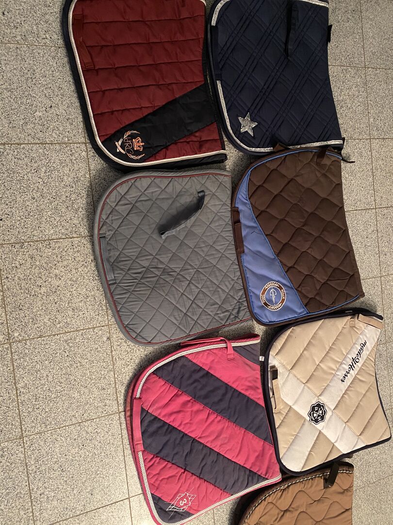 Saddlecloths Full - Jag har flera sadelkuddar till salu, från 10 euro. Sadelkuddarna är alla i storlek Full. De är alla dressyrsadelunderlag (sadelunderlag i Bordeaux kan också vara VS). Alla sadelkuddar och klättrare är i mycket gott skick! Sadelkuddarna har inga hål eller fläckar, vissa har några pälsrester😉. Kontakta mig om du har några frågor. Priserna är VB Enskilda bilder Bild 1= Beige/vit DR 15 Euro Bild 2= Blå med silverfärgade paljetter 20 Euro Bild 3= Bordeaux/mörkblått med beige och vitt DR eller VS Full 12 Euro Bild 4= grå med kant i bordeaux 10 Euro Bild 5= brun med blått Covalliero 15 Euro Bild 6= Rosa/blått med vit silversnodd 10 Euro Bild 7= Eskadron i brunt med snörkant 18 Euro