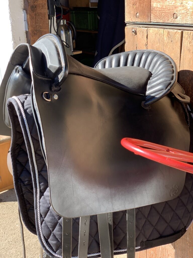 Sadel Deuber Ecuyer som ny (S2) - Mycket sällan använd Academic Baroque Bent Branderup sadel av Deuber, modell Ecuyer. Sadeln användes mycket sällan. Sadelmakare kom för att kontrollera förra veckan: perfekt sadel och trädkontroll, mycket gott skick; rekommenderat försäljningspris från sadelmakare för denna begagnade sadel i nyskick: 1100,- EUR. S 2, K 2, medium. Kan justeras av sadelmakare. NP: från 2409,- EUR för närvarande. Beskrivning Se även t.ex: