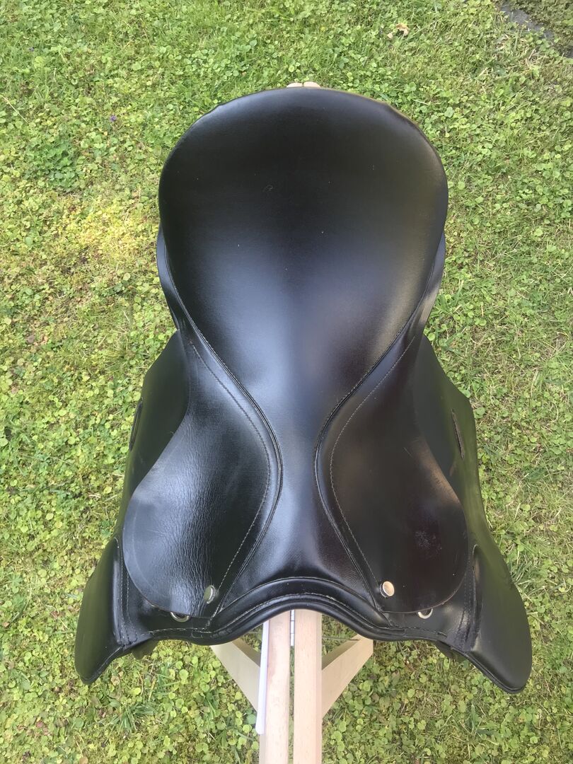 Sadel för eventing 17,5" - Vi säljer vår ponnys eventing-sadel. Sadeln har inte använts på länge och skulle behöva stoppas om. Den har lite missfärgning på sadelklaffen (se bilder), men det syns inte längre när man sitter i sadeln.
