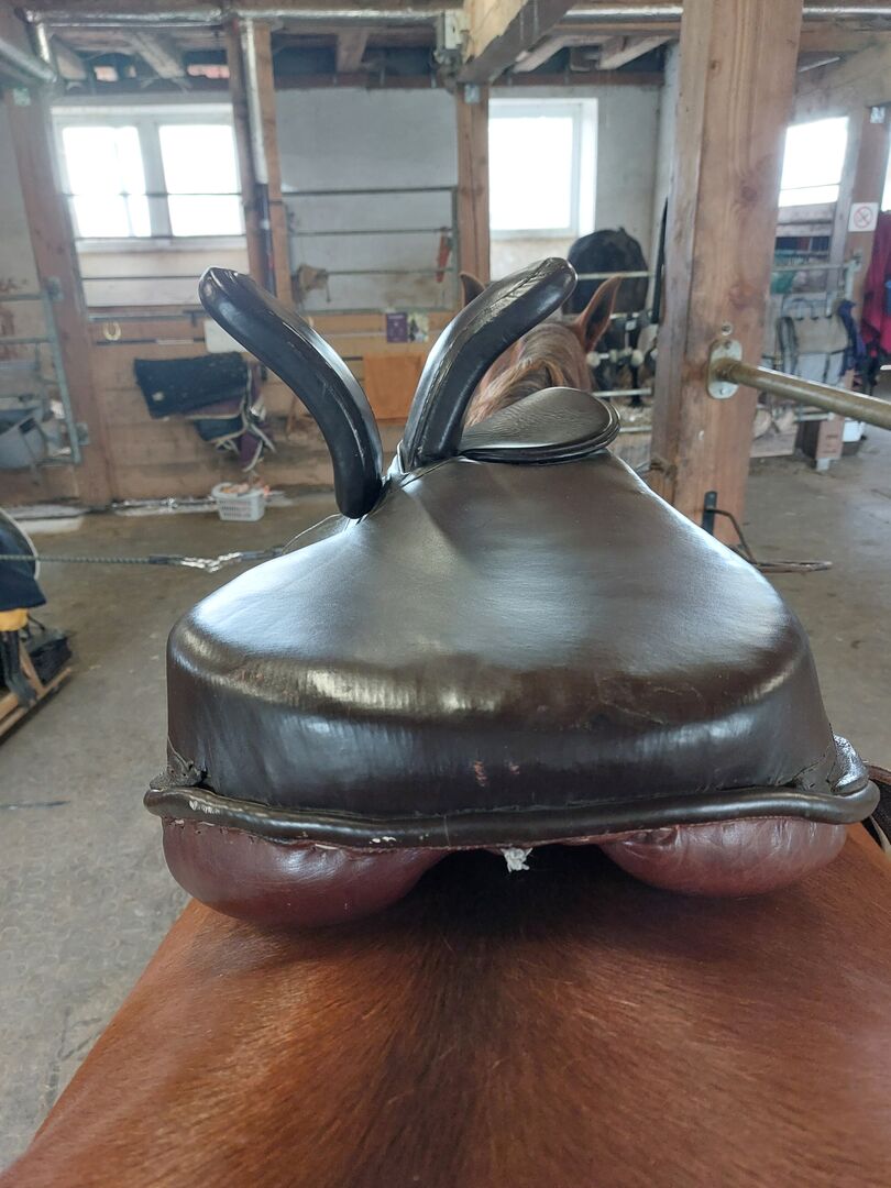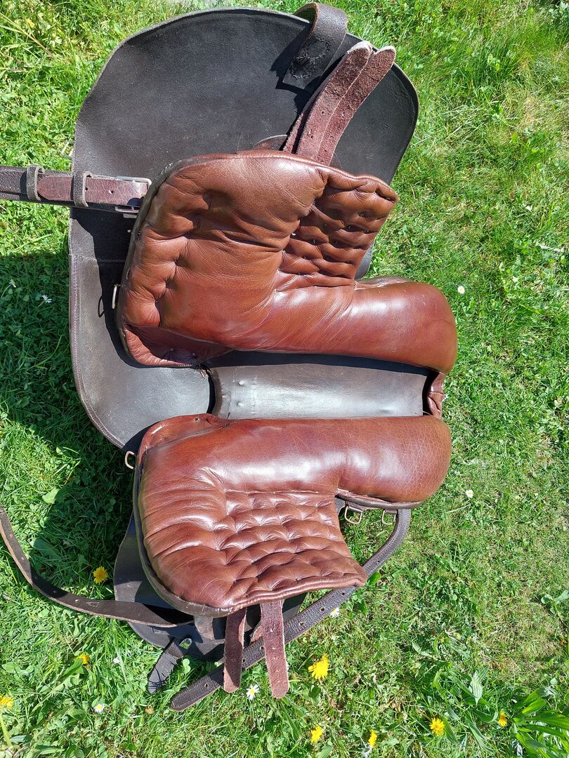 Sadel på sidan - Bra begagnad sidosadel med sadelgjord och skydd. Ett horn kan vridas.