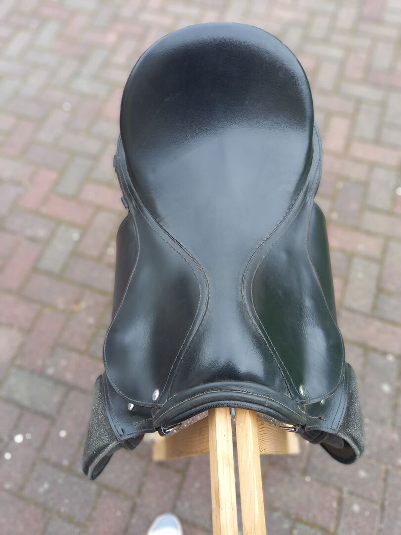 Sadel som används - Säljer en 17,5 tums sadel i bra skick. Kammarens bredd kan ökas och sadelribborna ändras. Spår av användning finns