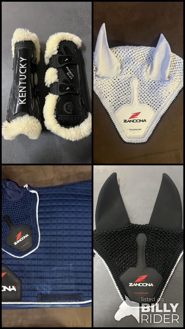 All different types of tack for sale due to not being used anymore: white flyveil(zandona)-40e blue flyveil(harry’s horse)- 40e black flyveil(kavalkade)-15e blue zandona set-100e black zandona set- 110e green set- 70e - everything is size full kentucky tendon boots-140e (size M) girth with sheepskin-130e (135cm and 145cm) zandona body protector- 90e (kid size)