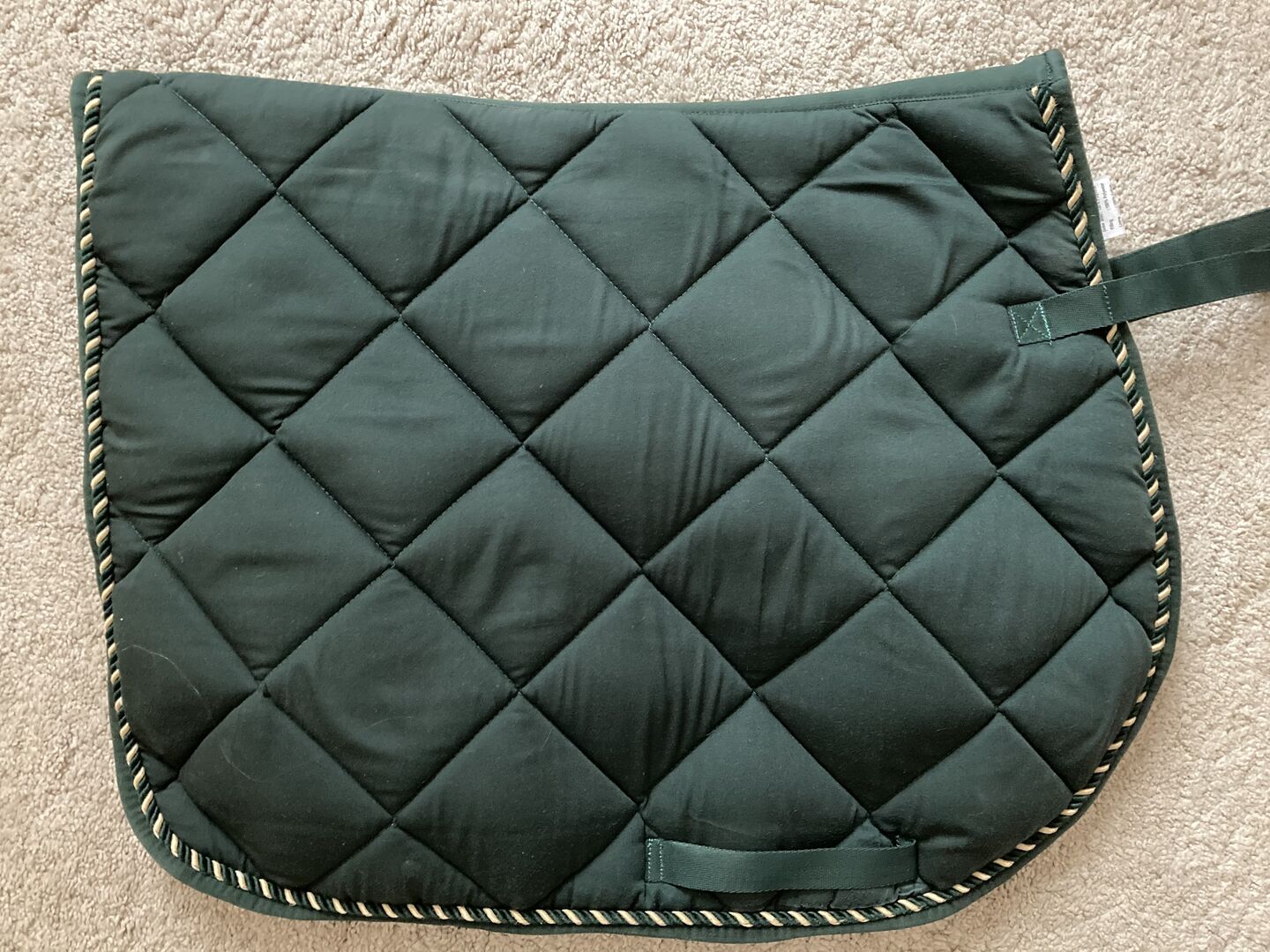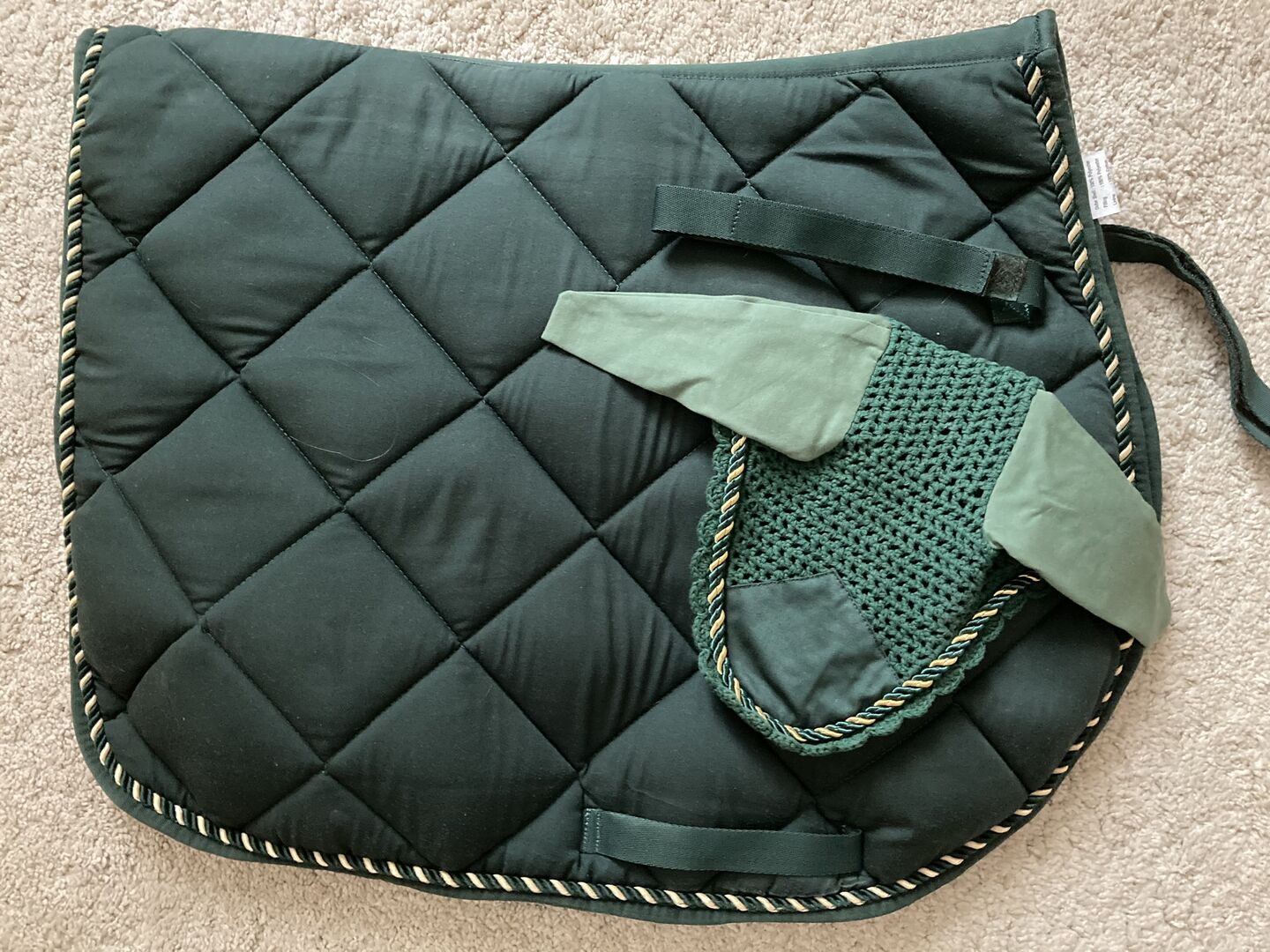 Sadelkudde + gummikudde - Den här sadelunderlägget har en gång suttit på hästen och är nu nytvättad. Flyghatten är ny, utan etikett.