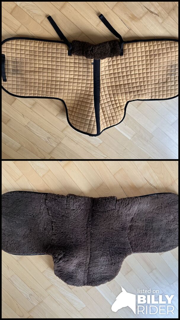 Egenskaper: Sadelunderlägg med hel päls (ca 30 mm lugghöjd) och pälskant framtill (ca 6 cm), Temperaturreglerande, Andas, Minskar tryck- och skavmärken, Förebygger hudirritation och hårbrott, Kardborreknäppning för att justera öglorna på sadelklaffen