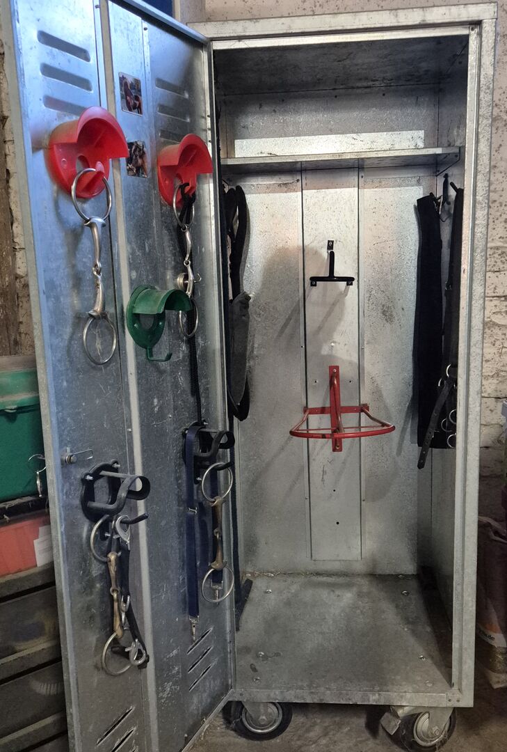 Sadelskåp - Jag erbjuder mitt sadelskåp 60 x 60 x 150 cm till salu. Det har hjul med bromsar. Detta gör det enkelt att ta med till en utställning. Det har plats för 2 sadlar och det finns också olika hängare och krokar.