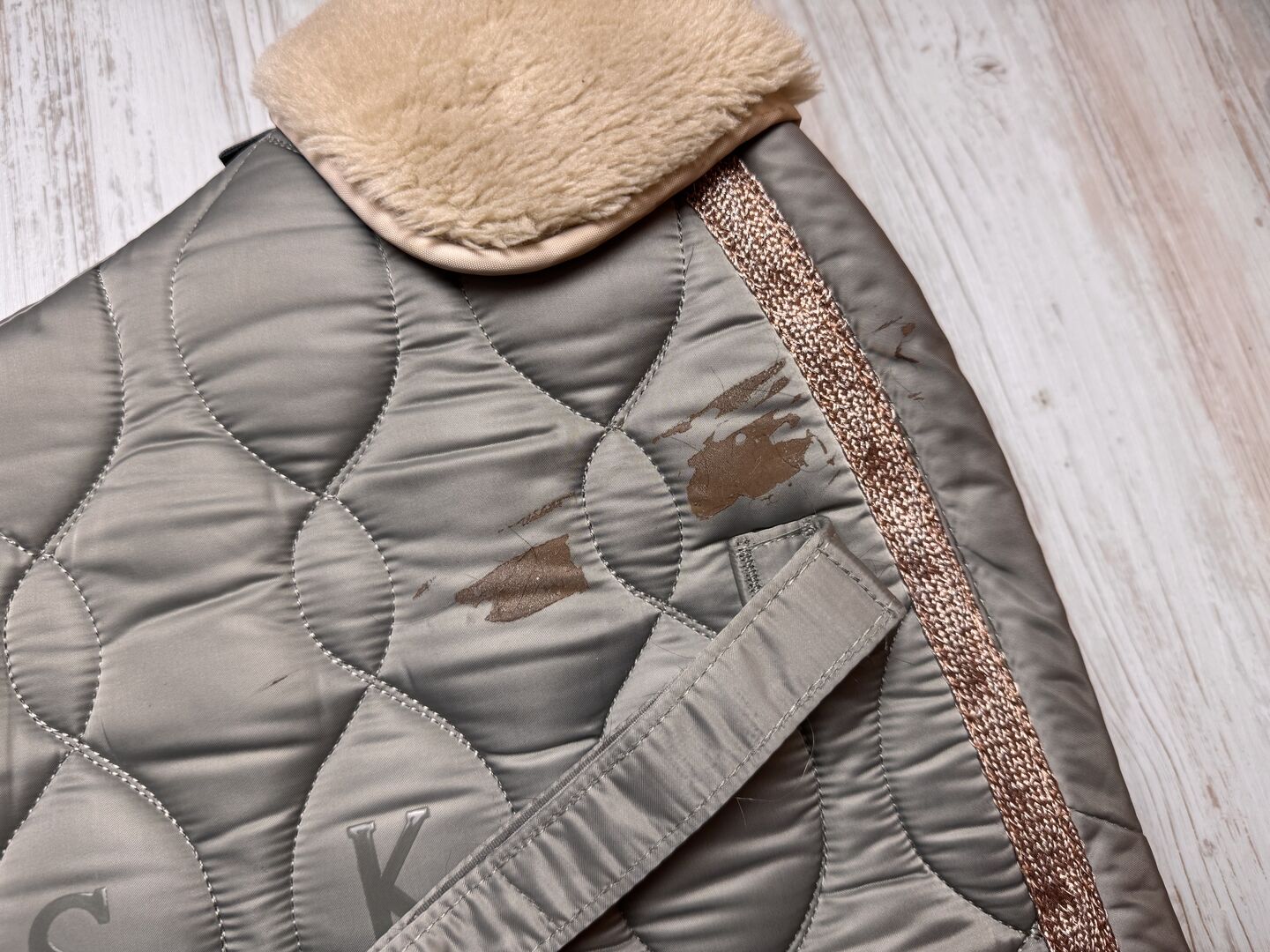 En liten missfärgning på ena sidan i det övre området, men märks inte under sadeln.