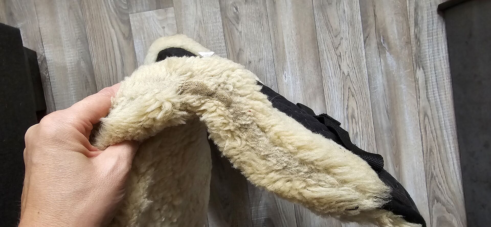Sadelunderlägg i lammskinn Horse-friends - Jag säljer ett sadelunderlägg i lammskinn från hästvänner (Loesdau). Den är i ett använt men mycket gott skick. Pälsen på framsidan har nötts av lite när man lagt i sadeln och tagit ut den ur garderoben (se de 2 sista bilderna). Detta är dock endast en kosmetisk defekt och påverkar inte sadelgjordspanelens funktion på något sätt. Den är stötdämpande och skyddar mot tryckpunkter. Dynan är anatomiskt formad och tillverkad av äkta lammskinn.