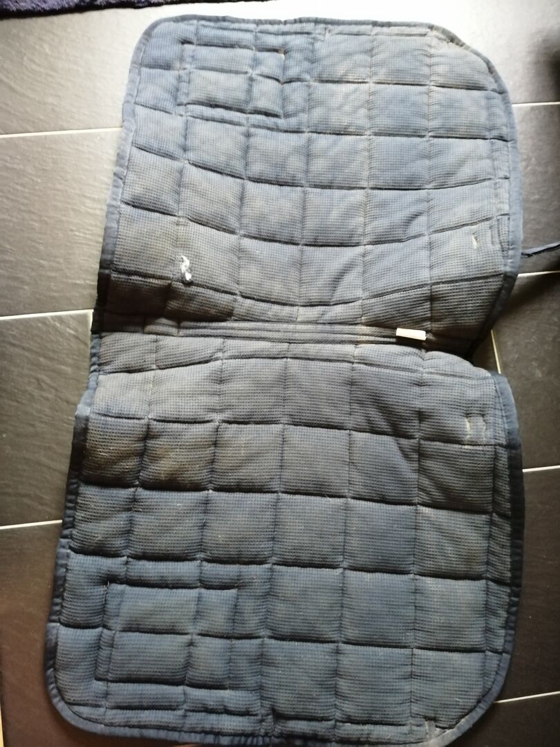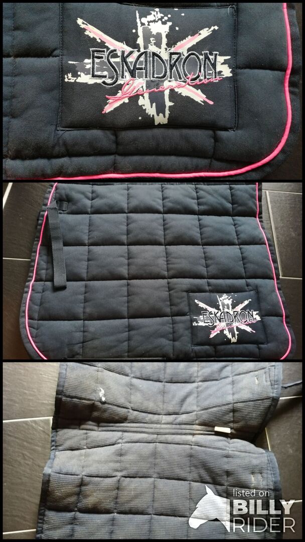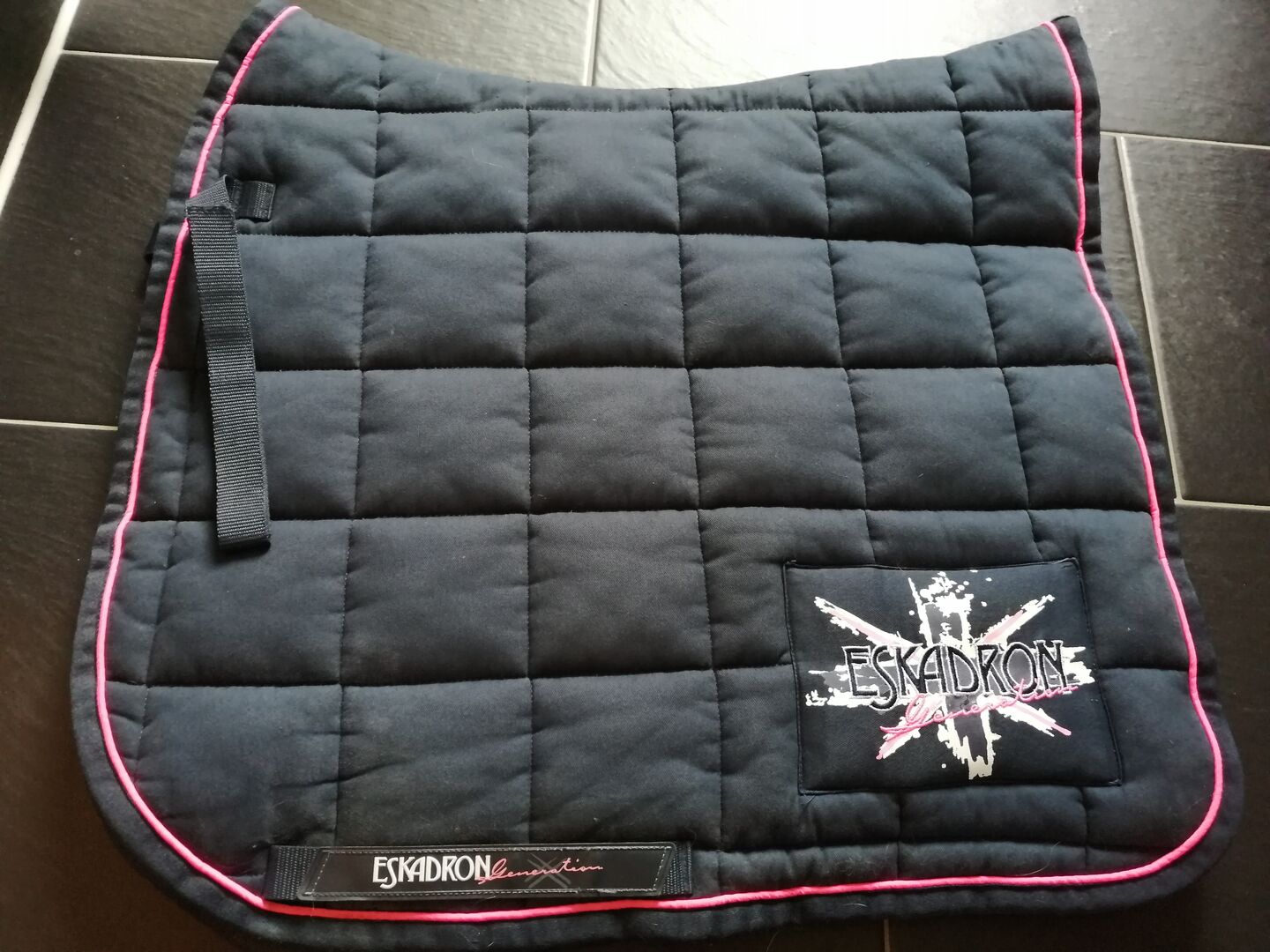 Sadelunderlag - Begagnat svart dressyrsadelunderlag med rosa dekoration från Eskadron. Sadelunderlaget kommer att rengöras igen innan det säljs. Det finns inga skador på utsidan, men insidan är inte lika bra som ny.