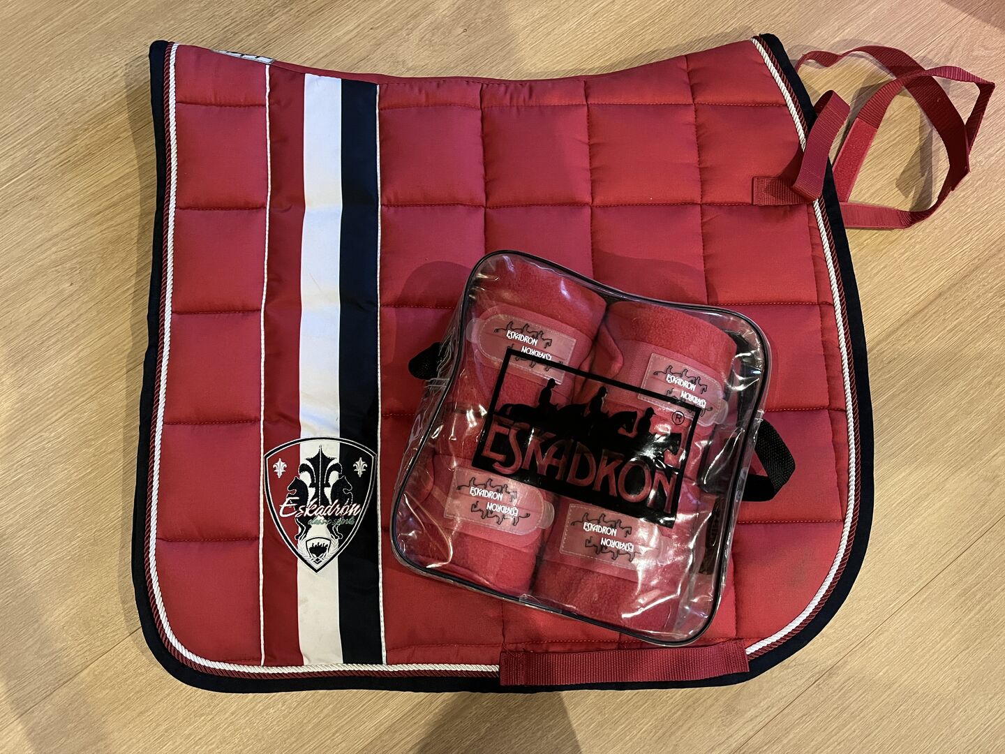 Sadelunderlag - Jag säljer min Eskadron-sadelunderlag i perfekt skick. Den har varit på hästen en gång och säljs därför otvättad. Den har inga fläckar eller smuts. Sadelunderlaget har förvarats hemma i ett rökfritt hushåll. De matchande bandagen är också i storlek WB och fortfarande helt nya.