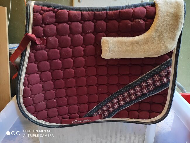 Sadelunderlag - Blått DR-sadelpad lite använt 15 €. Vinrött VS julschabrake lite använt 15€ Pummeleinhorn VS sadelunderlägg liten reva 10€ Blå Marinblått VS schabrak med rosa och turkosa hästmotiv 5