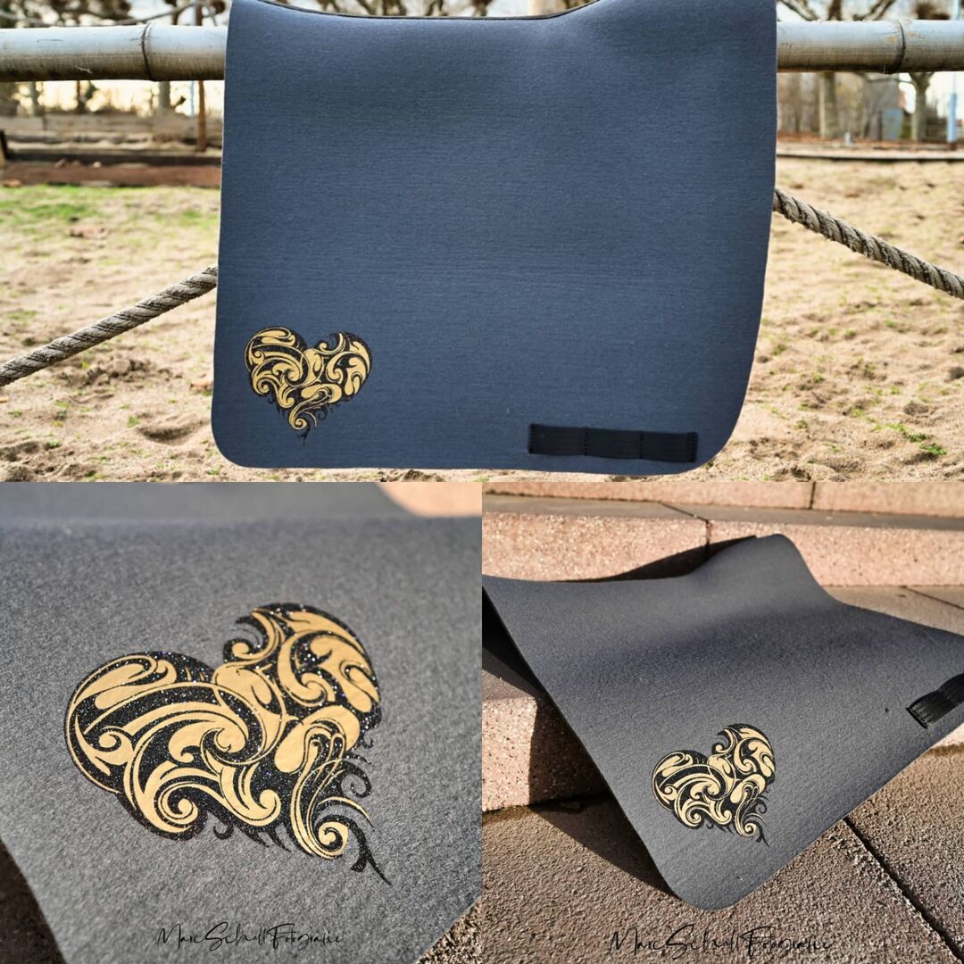Det här 5 mm tjocka sadelunderlaget är tillverkat av 100 % duvgrå ullfilt. Den ädla ytdesignen är i svart glitter och guld och har en vacker 3D-effekt. Den är skurna efter hästens ryggkurva och färdigställd utan några extra sömmar, vilket ger en perfekt passform med högsta möjliga komfort.
