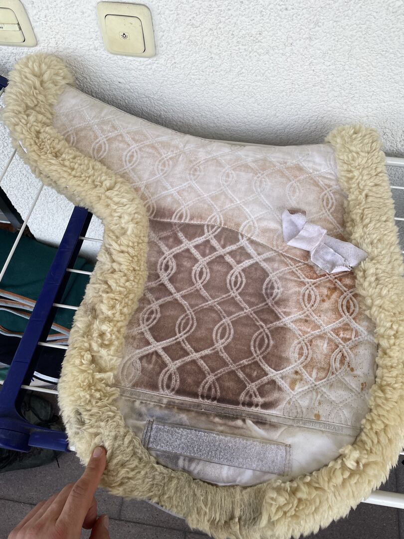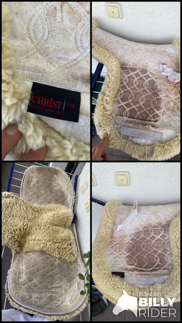 Sadelunderlag av lammskinn - Jag erbjuder ett vitt lammskinnsunderlägg från Christ i storlek VS. Tyget är lite färgat från sadeln, men det syns inte under sadeln. Lammskinnet är felfritt.