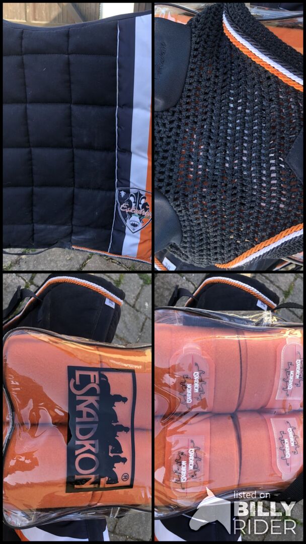 Sadelunderlag + Bandage + Fly cap - Jag säljer ett set bestående av en sadelunderlag, bandage och en flughätta. Sadelunderlaget har varit på hästen 2-3 gånger.