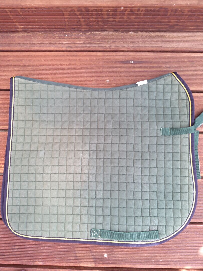 Sadelunderlag Dressage WB från Equiline grönt - Grön sadelunderlag från Equiline i WB dressyr, med mörkblå/gul kant. Färgen är lite blekt, annars inga skador.