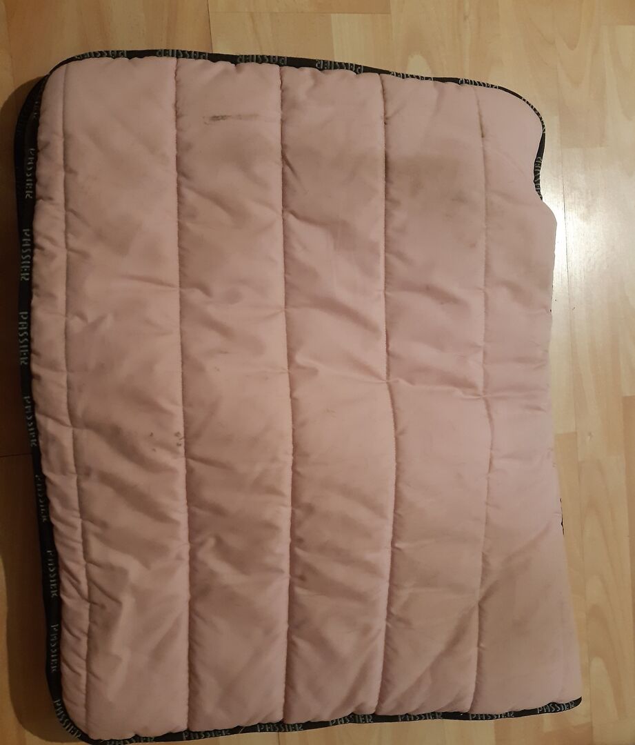 Sadelunderlag för dressyr - Sadelunderlag från Passier, vändbar grå sida utan defekter, rosa sida med små tecken på användning.