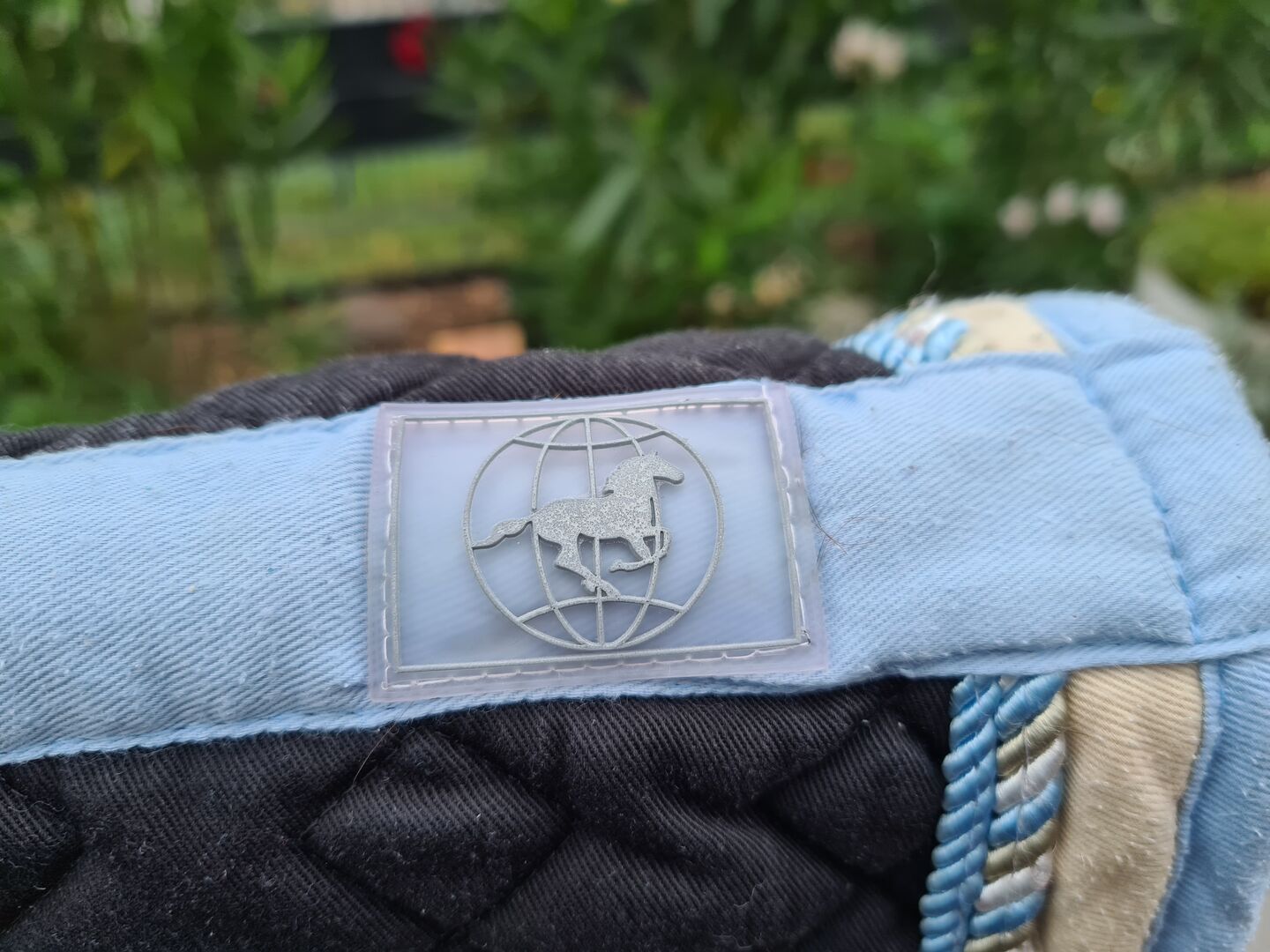 Sadelunderlag och gummikåpa - Setet består av ett sadelunderlag DR storlek Full och en matchande flughätta. Tyvärr känner jag inte till märket. Materialet är av bomull och visar redan en viss pilling och blekning eftersom det har använts mycket ofta. Velcro har befriats från hår