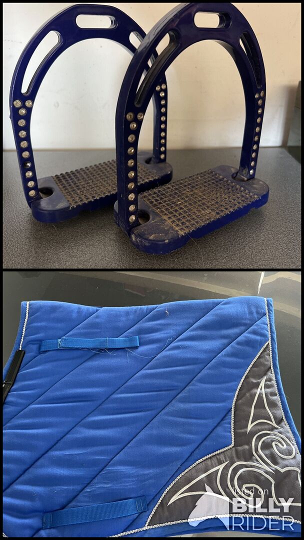 Sadelunderlag och stigbyglar - Vacker sadelgjord och blå stigbyglar en sten saknas