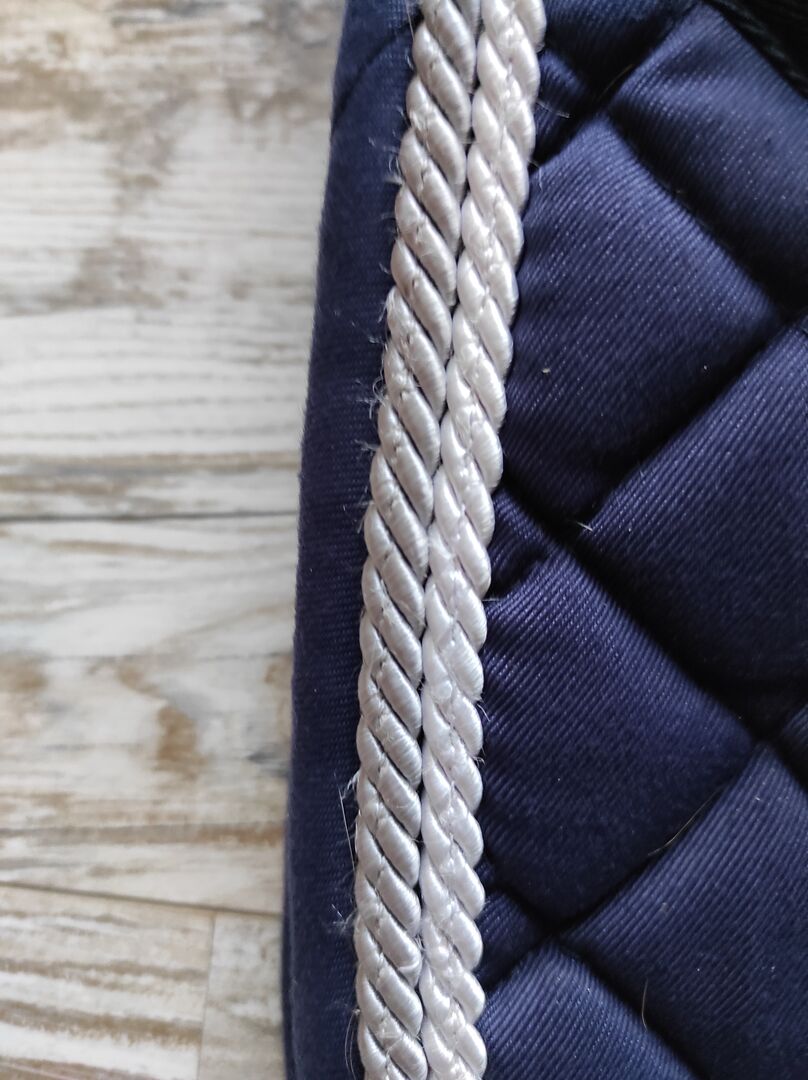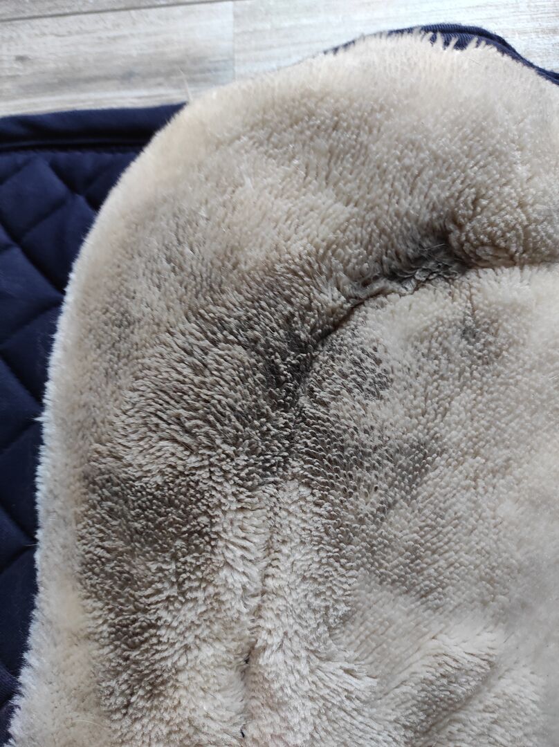Sadelunderlag WB DR - Vacker, blå sadelunderlag från Equiva med syntetisk päls. Nyligen tvättad, men jag kunde ändå inte få bort alla fläckar (se bilder).