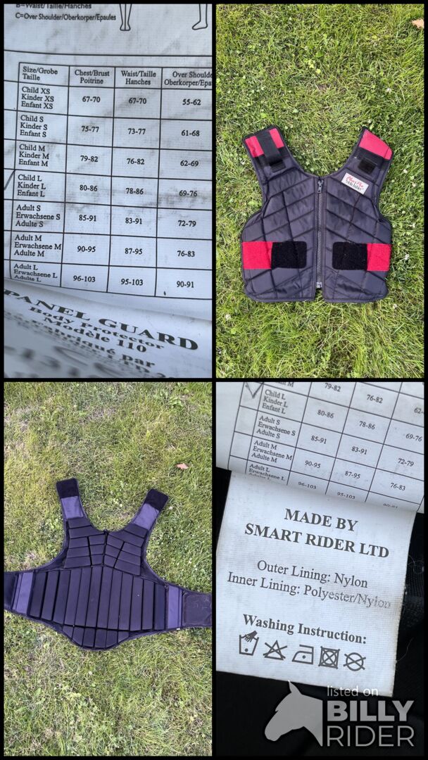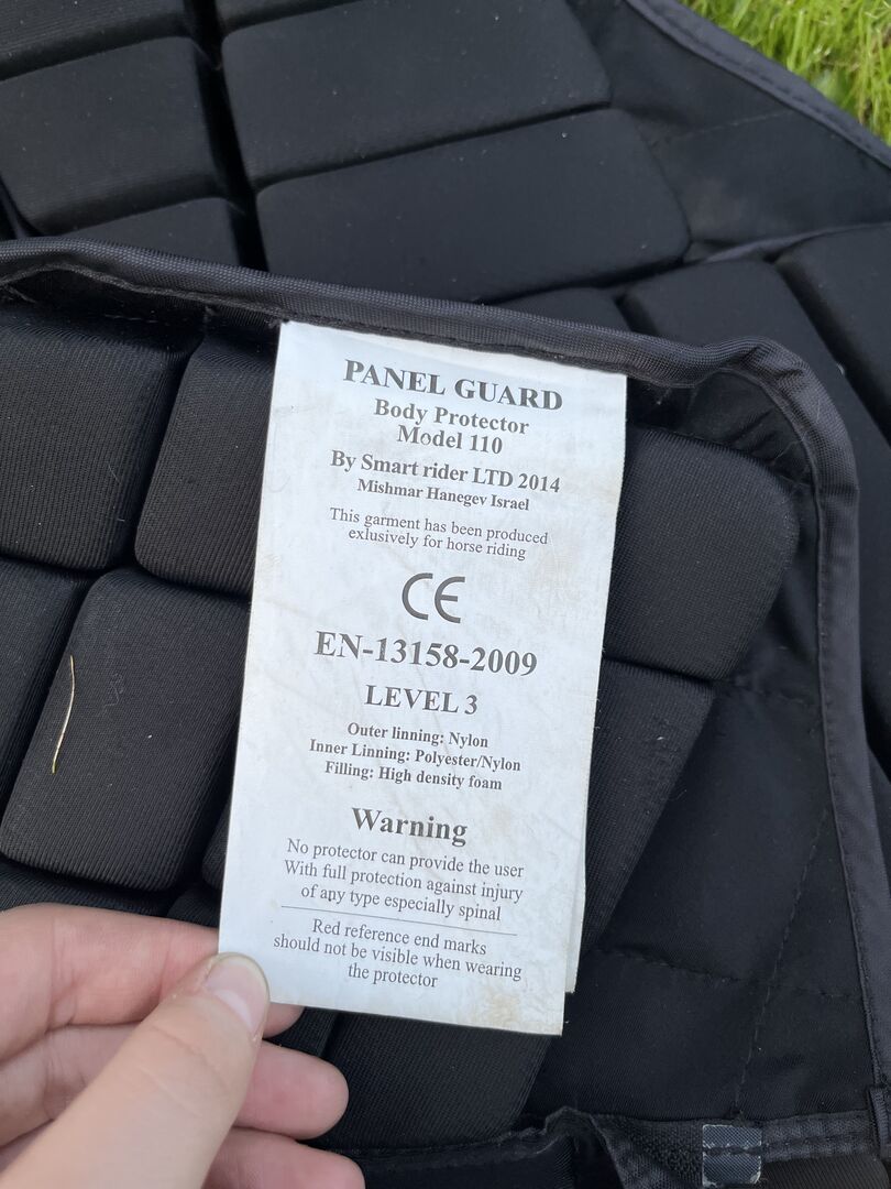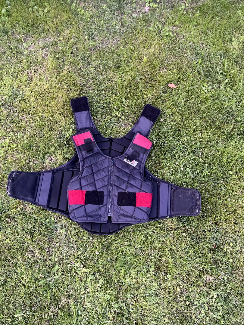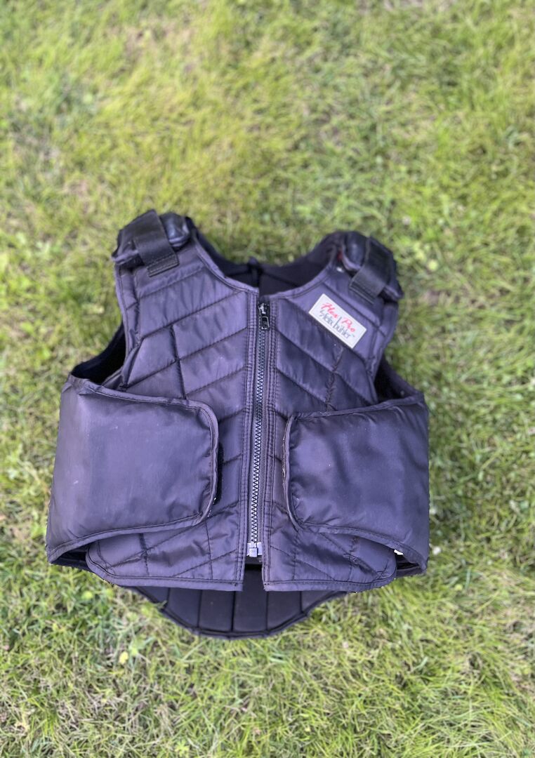 Säkerhetsväst Felix Bühler - Jag säljer en hoppväst i barnstorlek L. Bröstomfånget är 80-86cm, midjan 78-86cm och bålen/axlarna 69-76cm. Västen är väl och brett justerbar vid axlar och midja. Skyddet för svanskotan är vikbart. Yttertyget är tillverkat av nylon och innertyget är tillverkat av nylon och polyester. Västen har god dämpning och bra passform.