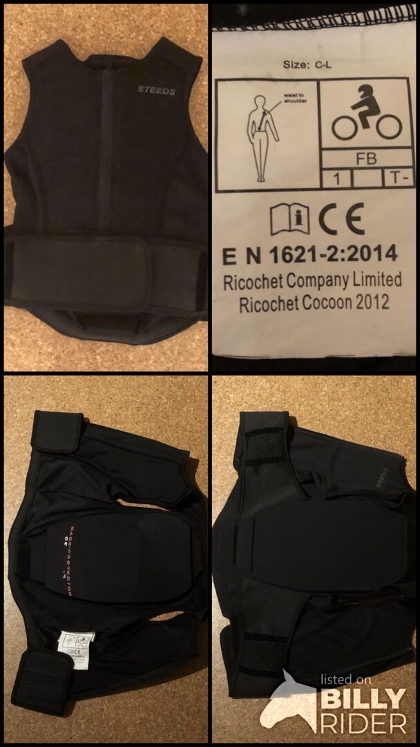 Säkerhetsväst / ryggskydd för barn i storlek C-L - Hej på er! Jag säljer en väst från Steeds. Den har en kardborreknäppning och en dragkedja för att stänga den. Den har varit sliten men har inte varit i ett fall. Det finns dock små tecken på användning, såsom skrivningen på insidan (bild 2), men detta begränsar inte dess användning. Storleksangivelsen är C-L, vilket motsvarar en kroppslängd på 1,27-1,41 m (bild 3+4).