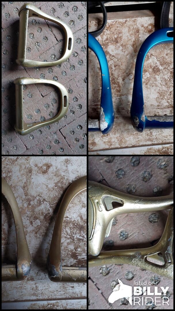 Sälja 3 par Lorenzini stigbyglar - Säljer 3 par stigbyglar av Lorenzini, 2x guld, har varit nymålade. Men har tyvärr delvis skalat av igen. Förutom blå, också skalade av.
