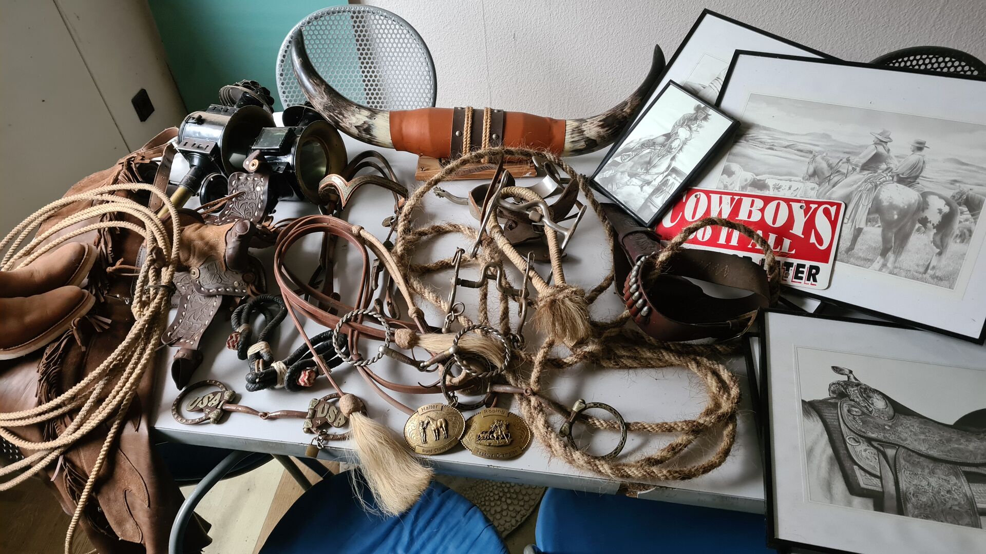 -Läderhölster -Rope -Mecate - flera bitar -2 vagnslampor -Stövlar -Chaps - V-huvudstall - 2 spännen - olika inramade kalenderbilder av Wolfgang Rabe - Plastskyltar Cowboys gör det förr eller senare - hängslen - 3 hattar (visas inte på bilden) - Sporrar med remmar -Longhorn deco -mini western-sadel