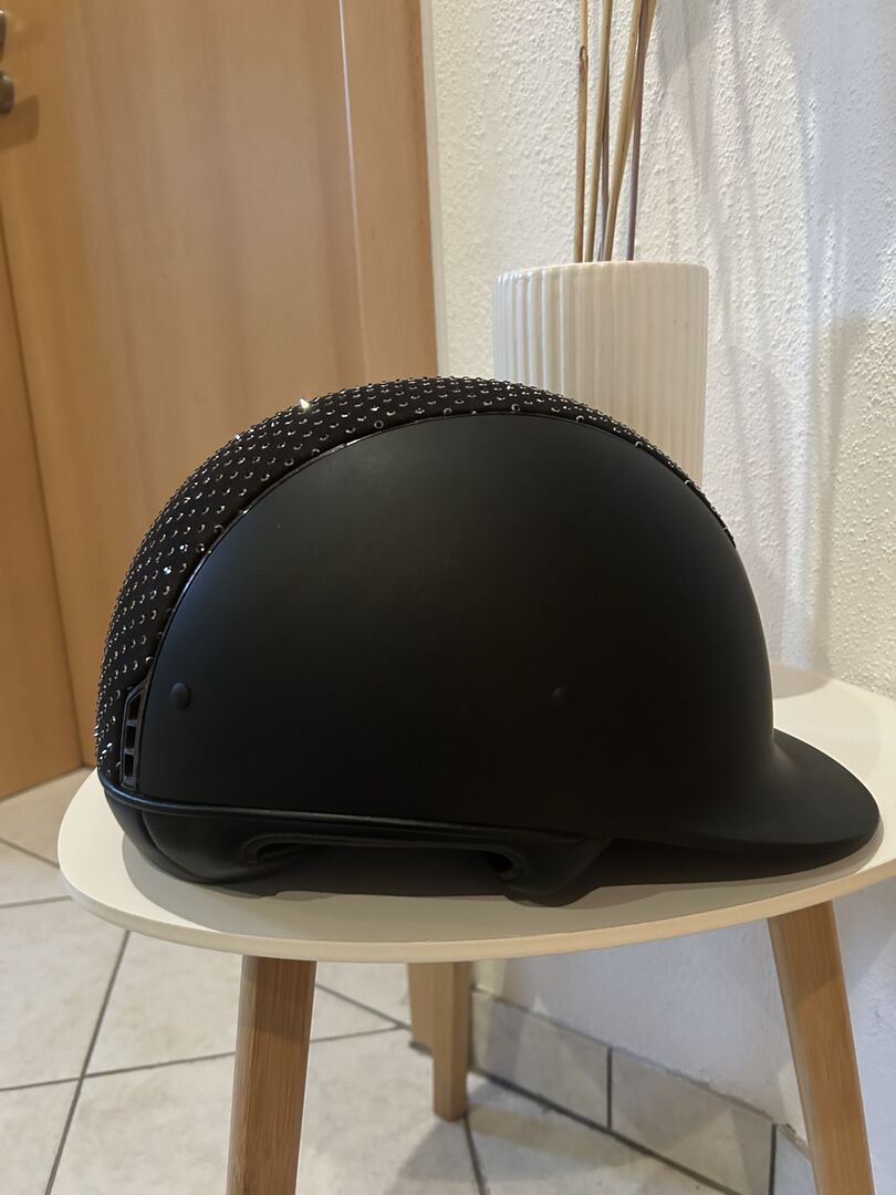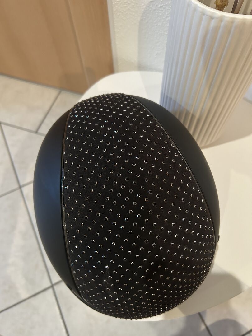 Samshield ridhjälm M svart Swarovski, glitter, så gott som ny - Jag erbjuder till försäljning min som ny Samshield ridhjälm med M-skalet. Jag inkluderar också den ursprungliga dammpåsen och inlägget i storlek (57). Inläggen kan bytas ut och tvättas beroende på huvudstorlek. Jag har använt hjälmen en gång på turneringen så den är kraschfri. Den har inte heller några repor eller missfärgningar. Blussningen är i "crome black" och topplacket är "raindrops Swarovski black, Silver"