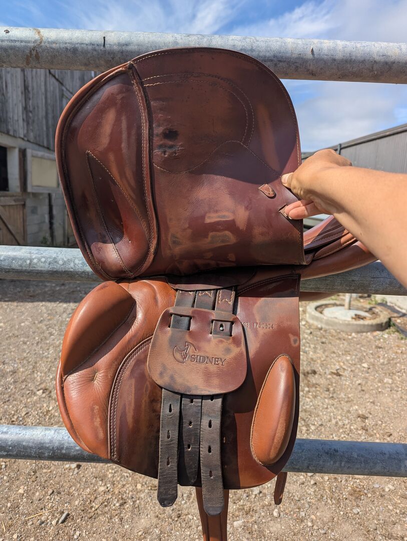 Sattel Prestige Modell Sidney - Verkaufe meinen geliebten Sattel. Den är dock inte till min yngsta häst, storlek 33. Satteln är ca 20 år gammal. Liten skada på sadelbladet, se foto (röd cirkel). Den gulmarkerade delen vill jag inte lägga till i förstärkningen. Die Steigbügelriemen und den Sattelgurt gebe ich dazu.