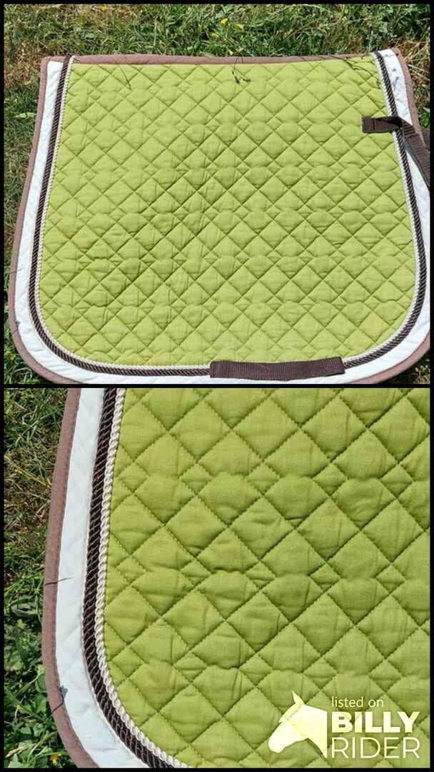 Die Schabracke wurde nur selten benutzt und ist in gutem Zustand. Sie zeigt im inneren leichte Gebrauchsspuren (ein paar lose Fäden, aber keinerlei Flecken oder Verbrauchsspuren). Sie hat schöne braune Verzierungen und wirkt dadurch sehr elegant. Meiner Rappstute stand die Schabracke super. Die Farben sind eher pastellartig und wirken nicht grell.
