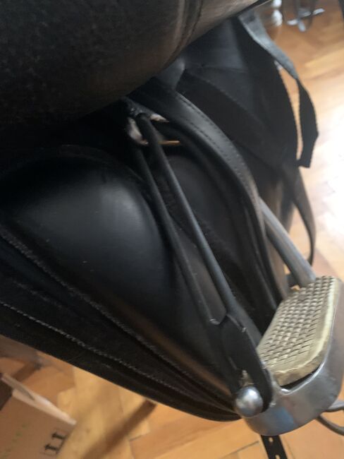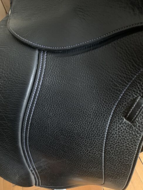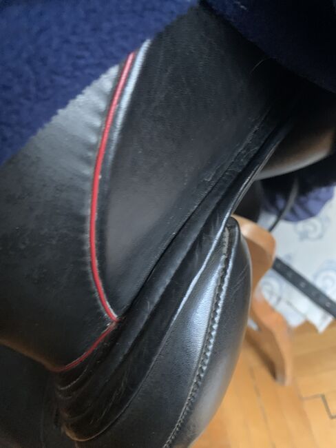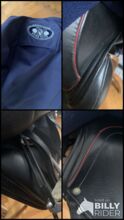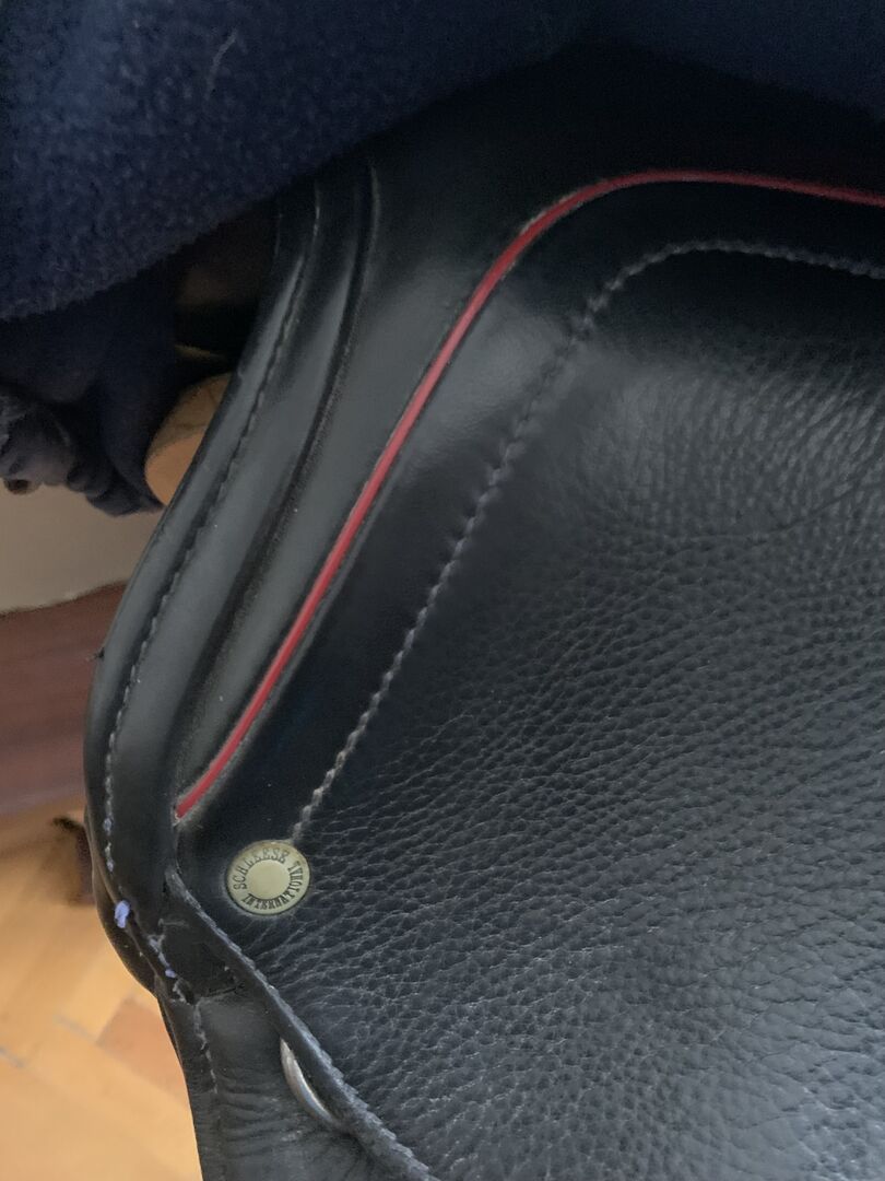 SCHLEESE PIRATE TILL SALU TILL FÖRMÅNLIGT PRIS - Original SCHLEESE PIRAT: svart läder, dressyrsadel, röda och mörkblå applikationer, mycket gott skick, begagnad, välvårdad, sadelstoppning förnyad, original sadelöverdrag mörkblått med fickor