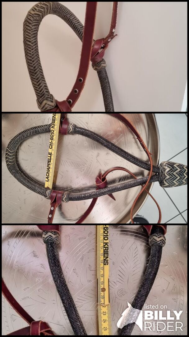 Schwarzes Bosal 5/8 inkl. upphängningsanordning - Denna vackra Bosal har jag själv vid tillfälle förvärvat. Leider passt es meinem Pferd nicht optimal und daher darf es weiter ziehen. Zu. rumhängen ist es einfach zu schade. Masse siehe Foto.